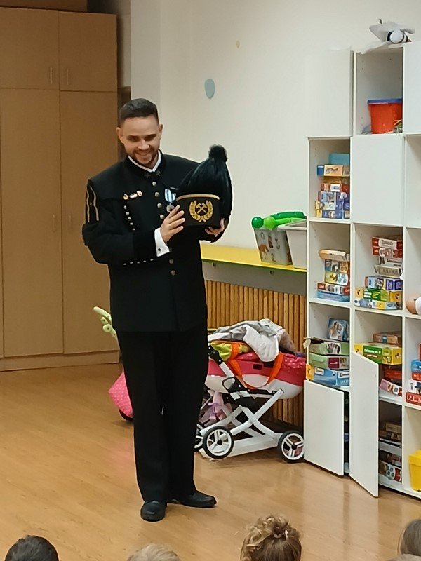 Dowiedziały się, w jaki sposób wydobywany jest węgiel oraz jak bardzo jest nam potrzebny w codziennym życiu. Górnik przybył do nas w stroju galowym, dlatego dzieci miały okazję przyjrzeć się z bliska mundurowi, czapce górniczej, odznaczeniom, które górnicy otrzymują za długoletnią, ciężką pracę w kopalni. Pan Artur wyjaśnił dzieciom, jakie znaczenie mają kolory pióropuszy na czapce i kto je nosi. Przedszkolaki chętnie i z zaciekawieniem wysłuchały opowieści. W trakcie wizyty zadawały wiele pytań, na które gość chętnie odpowiadał.