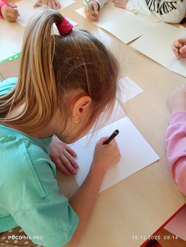 Kartki zostały przygotowane zarówno dla seniorów, jak i w ramach wymiany kartek świątecznych z języka angielskiego, podczas której dzieci utrwalały poznane słownictwo i zwroty związane ze świętami Bożego Narodzenia.