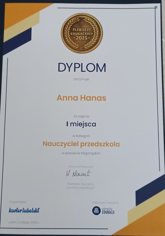 Miło nam poinformować iż Pani Anna Hanas, nauczycielka Samorządowego Przedszkola nr 2, otrzymała I miejsce w kategorii „Nauczyciel przedszkola” w powiecie biłgorajskim w plebiscycie Kuriera Lubelskiego 2025.