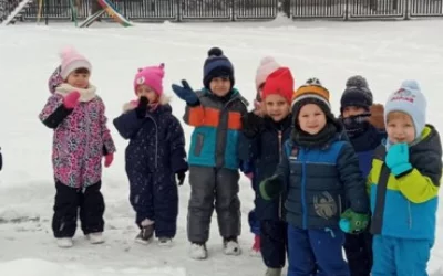 Korzystając z uroków zimy, przedszkolaki bawiły się na śniegu w naszym przedszkolnym ogrodzie.