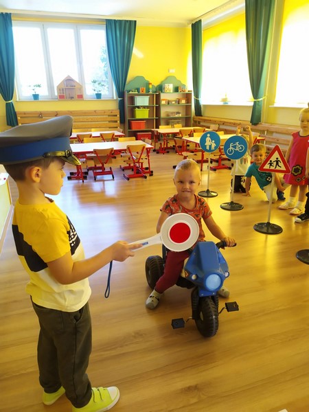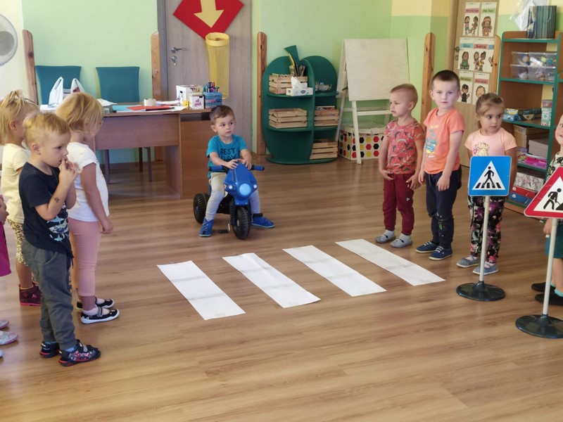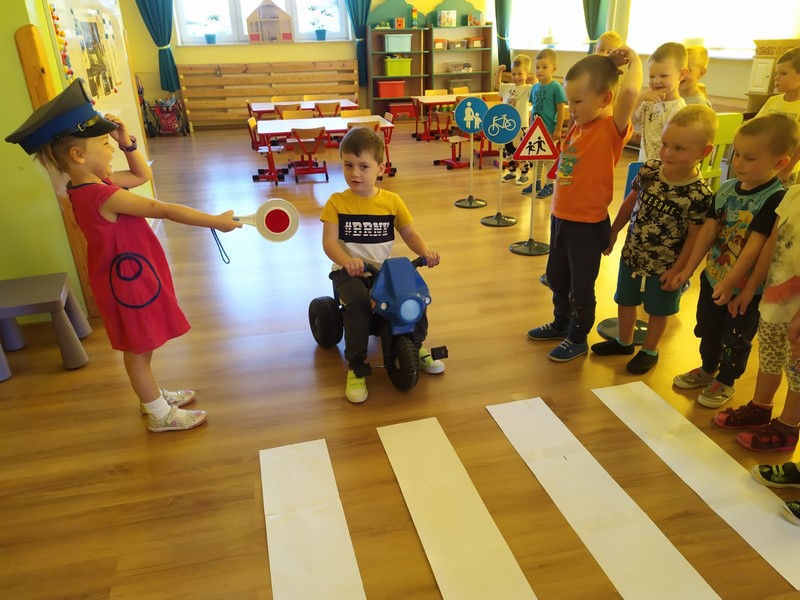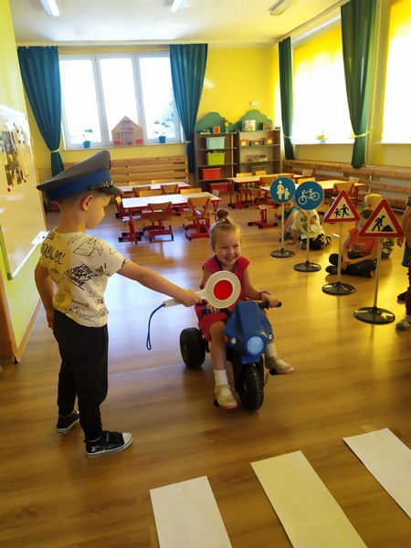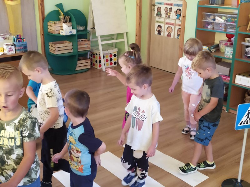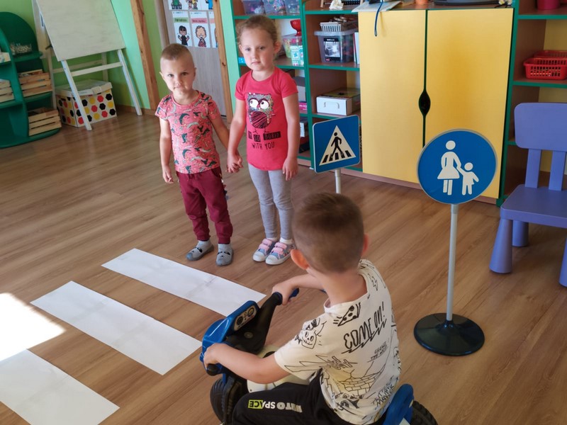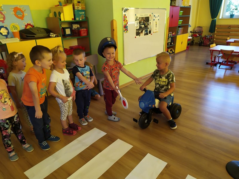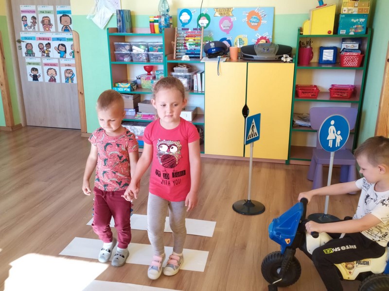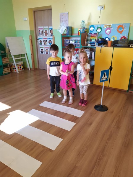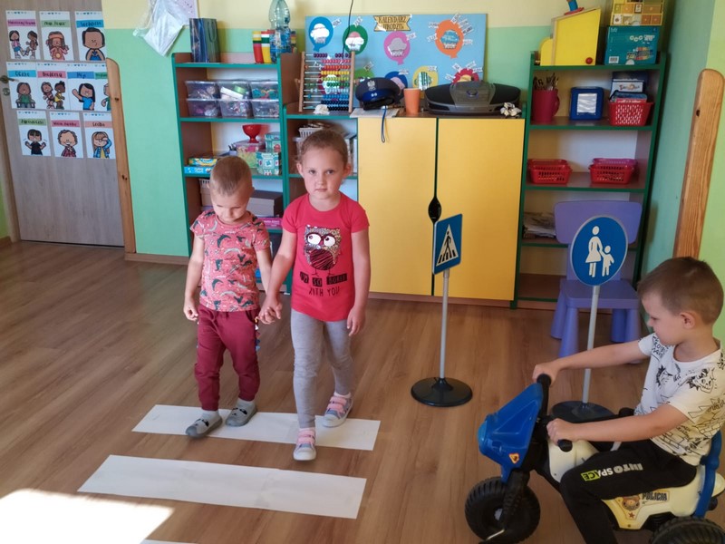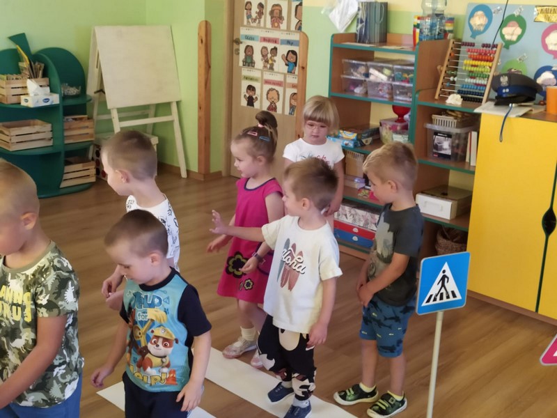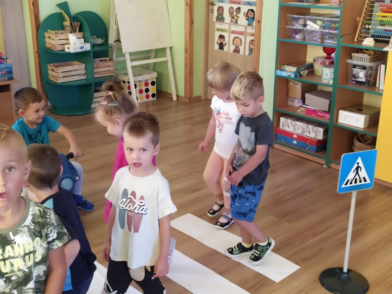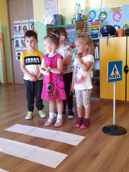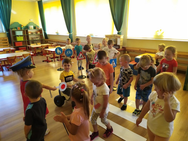 Smerfy uczyły się jak przechodzić przez przejście dla pieszych. Niestety byli też piraci drogowi, ale policjanci z naszej grupy doskonale sobie z nimi poradzili. Uczyliśmy się także znaków drogowych i jak zachować się podczas spacerów. Przedszkolaki bardzo chętnie odgrywały scenki i wcielały się w role.