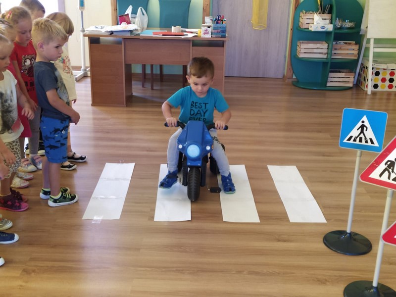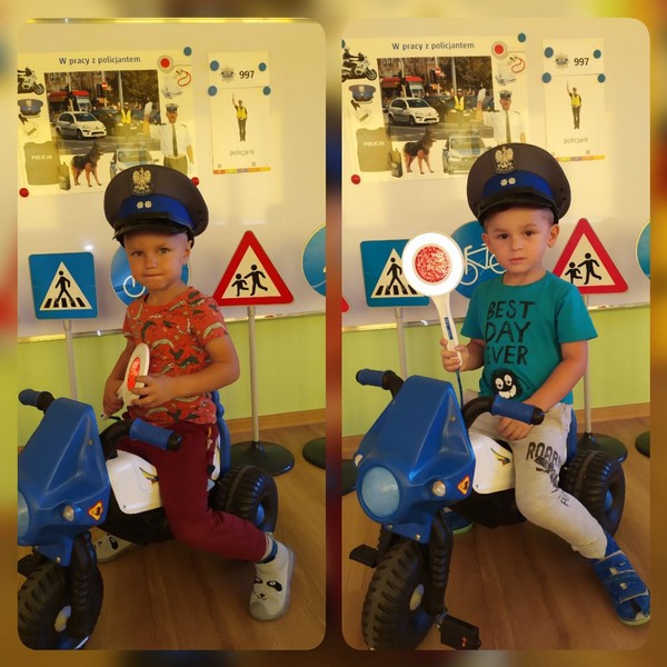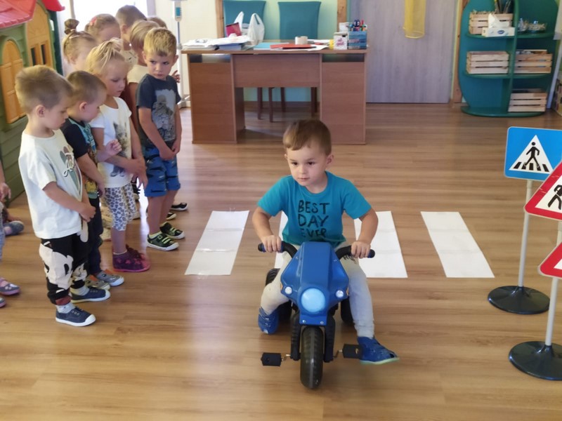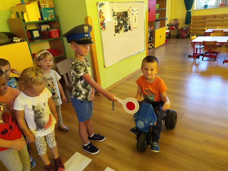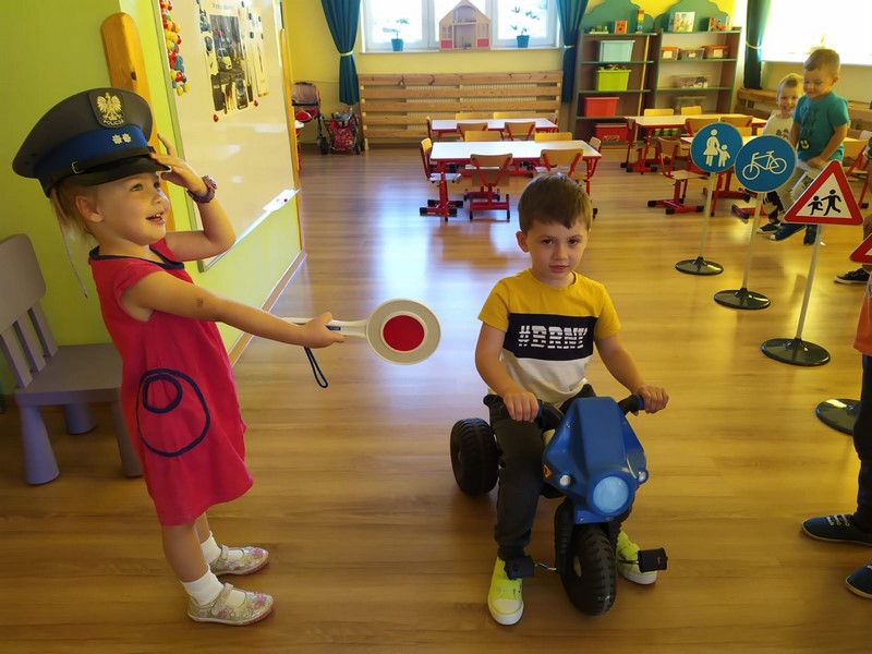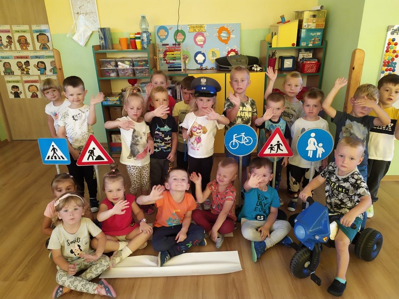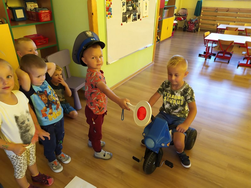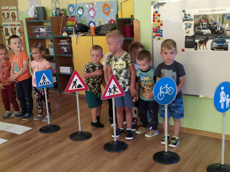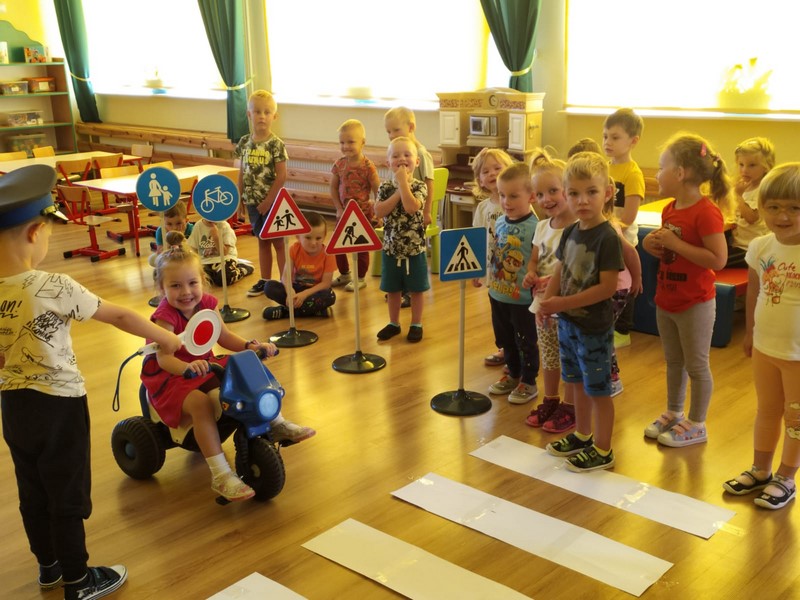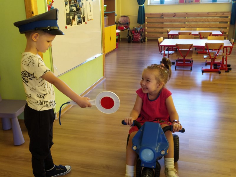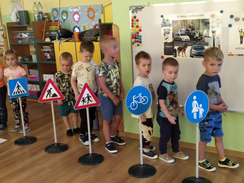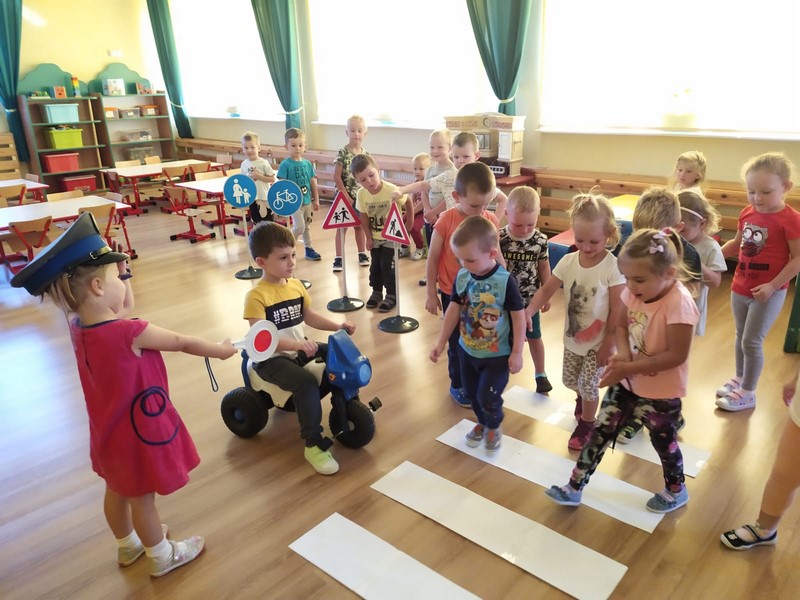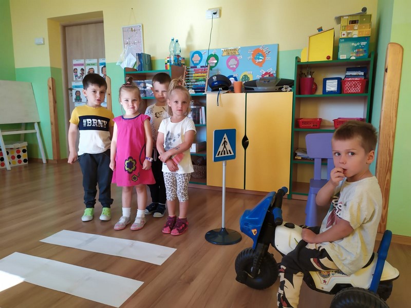 Smerfy uczyły się jak przechodzić przez przejście dla pieszych. Niestety byli też piraci drogowi, ale policjanci z naszej grupy doskonale sobie z nimi poradzili. Uczyliśmy się także znaków drogowych i jak zachować się podczas spacerów. Przedszkolaki bardzo chętnie odgrywały scenki i wcielały się w role.