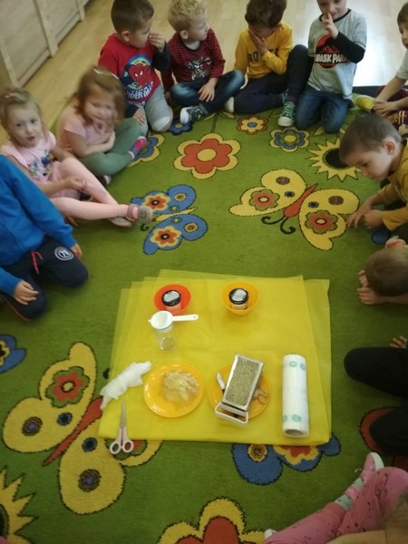 Dzieci poznawały organoleptycznie mąkę pszenną i ziemniaczaną.