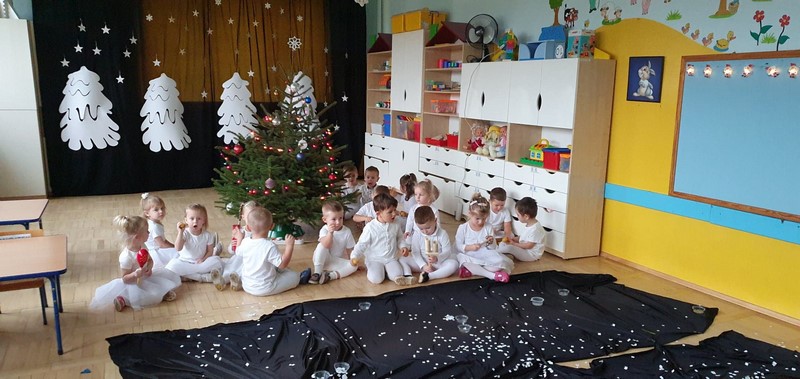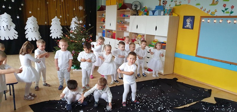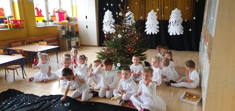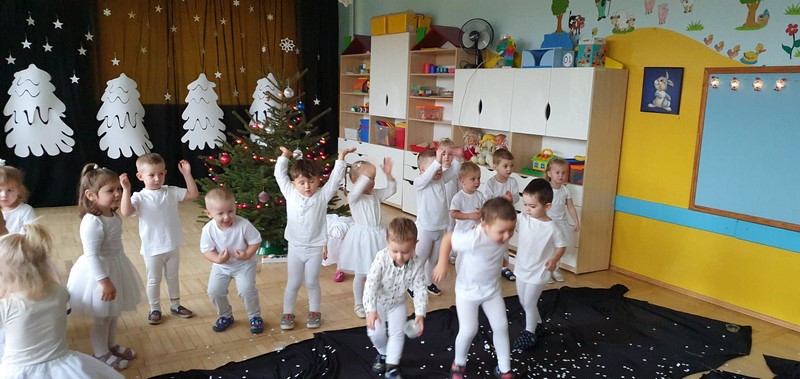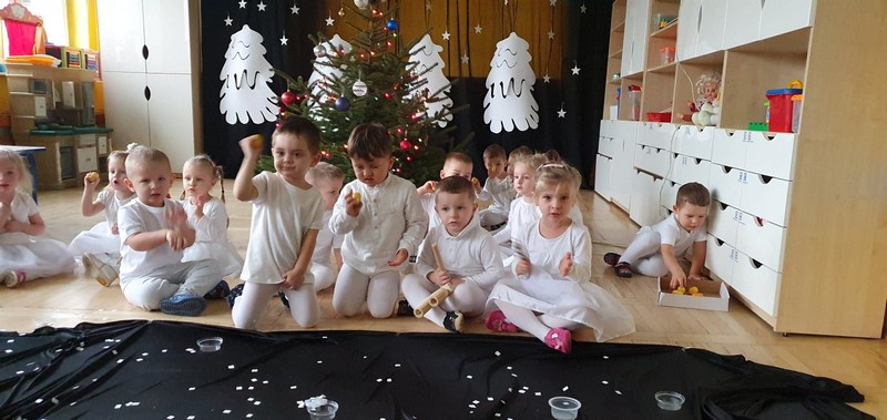 Najmłodsze dzieci w przedszkolu przygotowały przedstawienie świąteczne, wyczarowały śnieg, a potem grały na instrumentach, tańczyły i śpiewały. Była świetna zabawa.