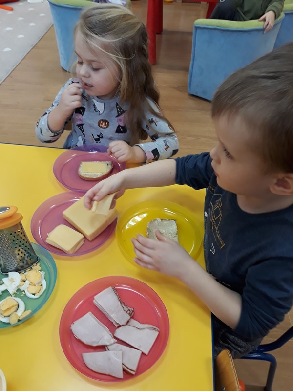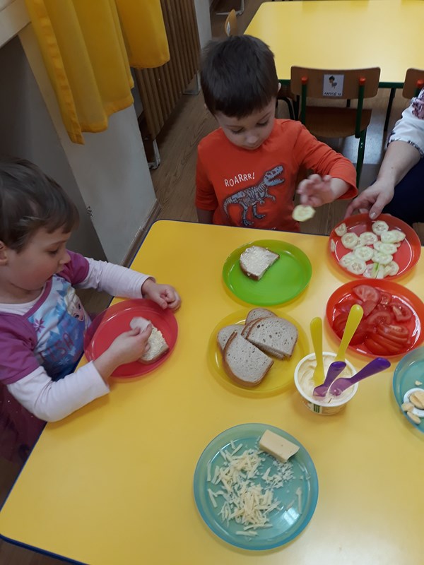 "Kanapki sami chcemy przygotować. Z jajkiem i ogorkiem bedą nam smakować" -śpiewały w tym tygodniu Tygryski, a w dowód tego, wcieliły się w role małych kucharzy, wykonując samodzielnie kanapki. Po starannym umyciu rączek przedszkolaki przystąpiły do pracy. 1.Jajko, ogorek, pomidor, a moze serek?2.Smarujemy pieczywo masłem. To wcale nie jest trudne!3. Jeszcze odrobina startego sera...