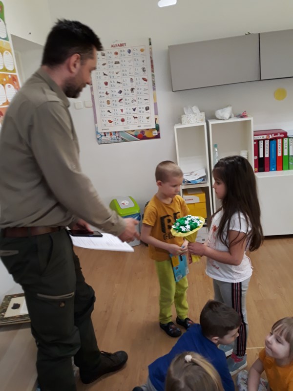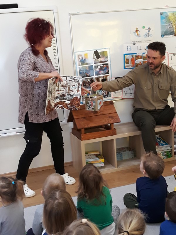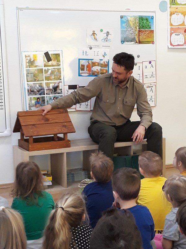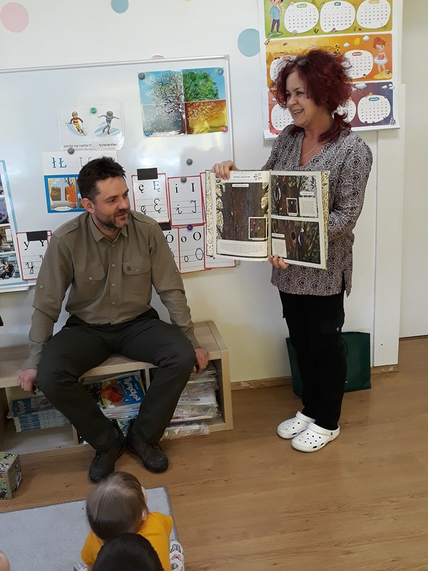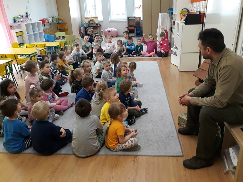 Przedszkole na ul. Przemysłowej odwiedził leśnik z Nadleśnictwa Zwierzyniec. Pan leśnik opowiadał dzieciom o zwyczajach leśnych zwierząt i ich ulubionych przysmakach. Przypomniał także o właściwym zachowaniu podczas kontaktu ze zwierzętami leśnymi. Zaznaczył, że człowiek przebywający w lesie jest gościem i musi szanować zwyczaje gospodarzy – zwierząt i ptaków. Przedszkolaki aktywnie uczestniczyły w spotkaniu, dzieląc się swoimi spostrzeżeniami na temat życia mieszkańców lasu. Zadawały też wiele pytań dotyczących pracy leśników w lesie.