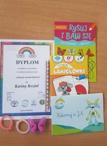 Z przyjemnością informujemy, że praca Karinki z grupy „Jeżyki” zdobyła wyróżnienie w Ogólnopolskim Konkursie Plastycznym „Emocje oczami dziecka”, objęty patronatem Akademii JA, Fundacji KALOS i Instytutu Rozwoju Emocji. Do organizatorów przesłano 22 prace z całej Polski. Głównym celem konkursu było rozpoznawanie i nazywanie podstawowych uczuć i emocji oraz kształtowanie umiejętności wyrażania emocji poprzez różne formy plastyczne.