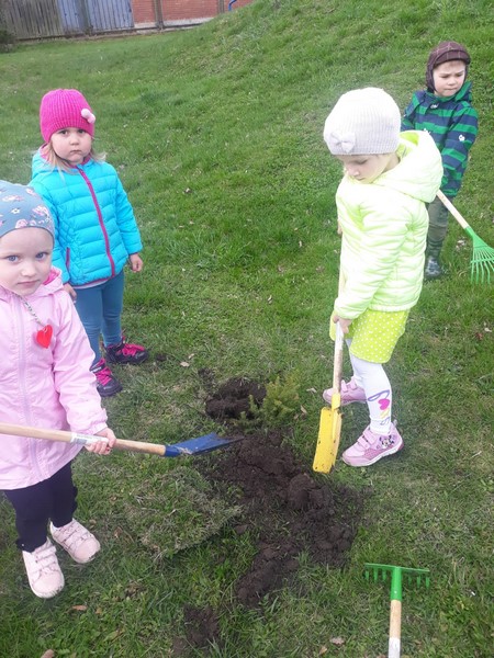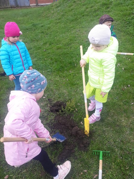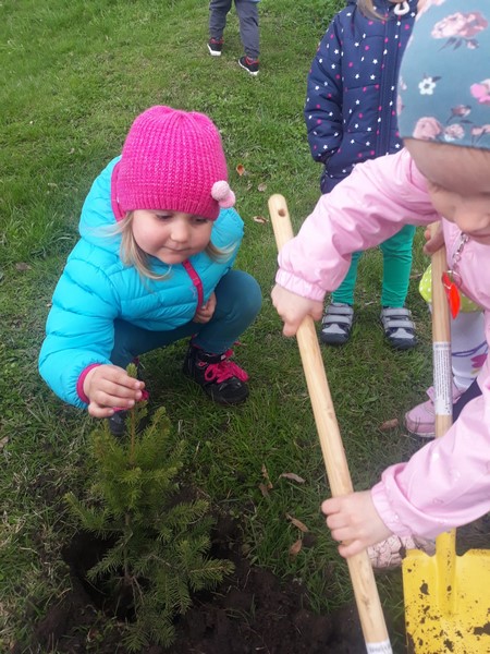 Najpierw dzieci oglądały prezentację „Dbajmy o naszą planetę Ziemię”. Później każda grupa wykonała „Portret Ziemi”, z których stworzono piękną wystawę dla dzieci i rodziców. Następnie dzieci z każdej grupy wyszły na plac przedszkolny i przy pięknej pogodzie posadziły dwadzieścia świerków i sosen aby upiększyć nasze otoczenie. Kolejnym punktem był przemarsz przedszkolaków alejkami placu przedszkolnego z okrzykami zawierającymi ekologiczne hasła: