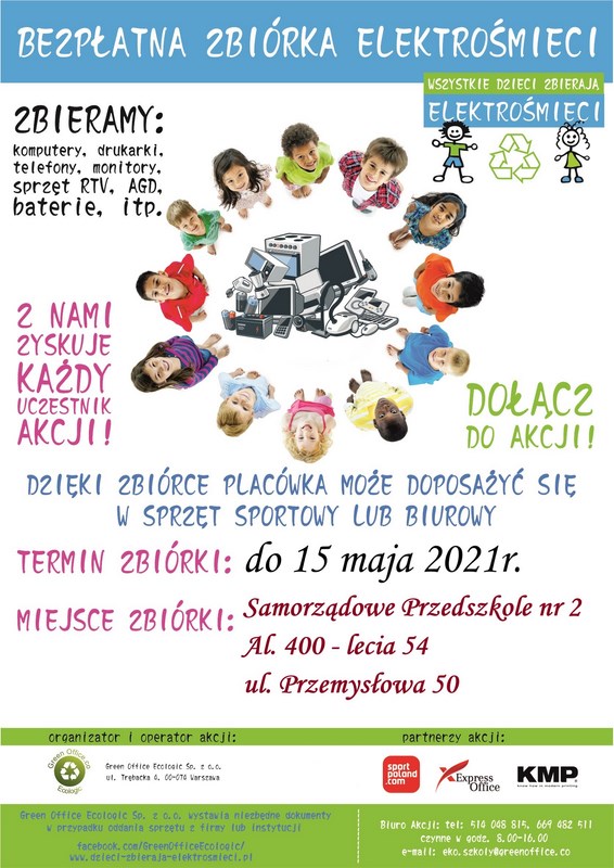 Serdecznie zapraszamy wszystkich rodziców, firmy prywatne, instytucje oraz wszystkich sympatyków przedszkola do zbiórki elektrośmieci tj. wszystko co jest na prąd lub baterie, np. sprzęt komputerowy, biurowy, rtv, agd, itp.