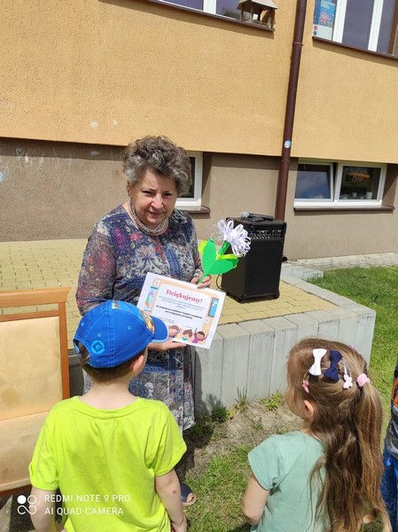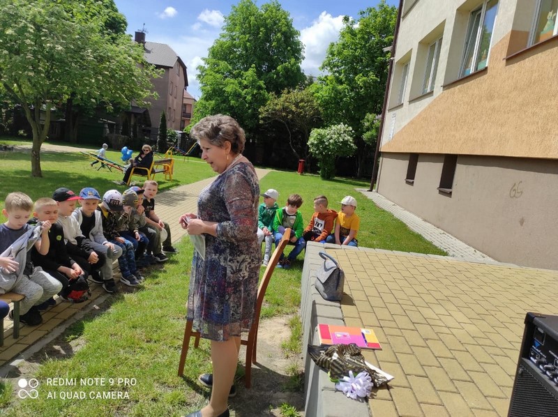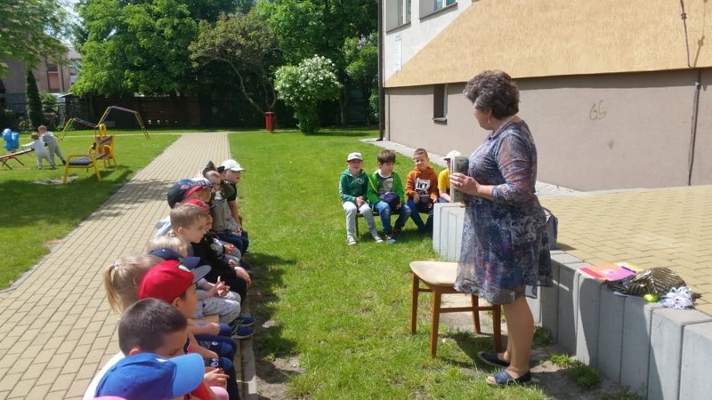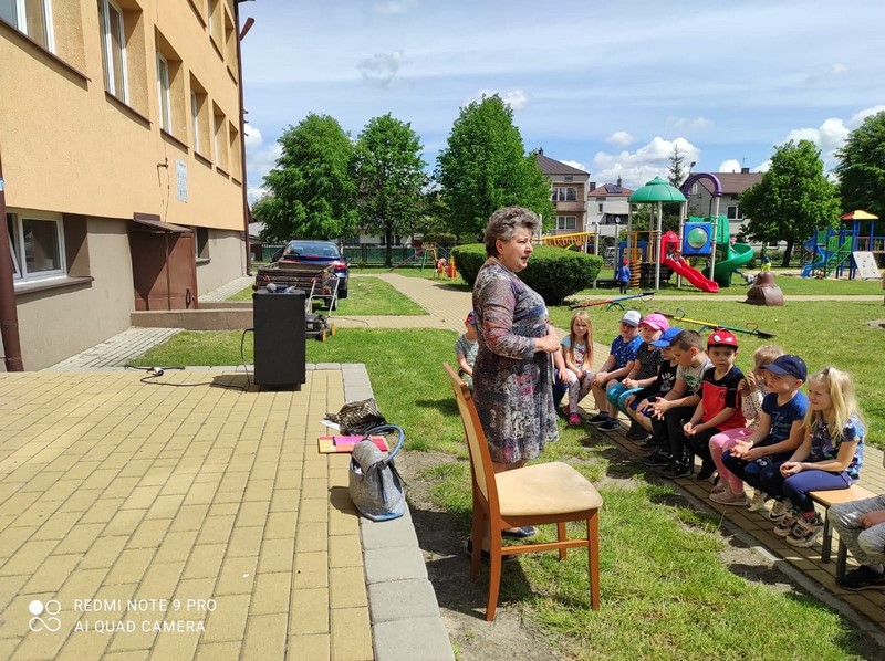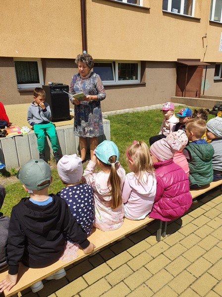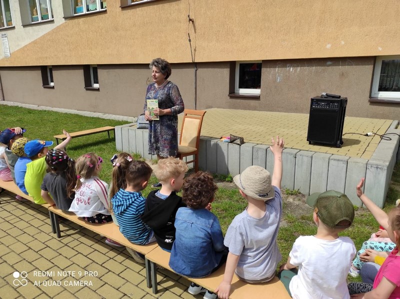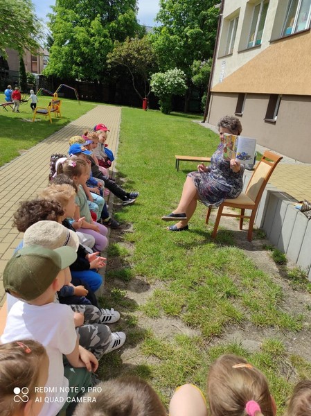 W poniedziałek 24.05 korzystając z pięknej pogody nasze przedszkole odwiedziła Pani bibliotekarka. Na placu przedszkolnym odbyły się zajęcia biblioteczne. Celem tej wizyty było przybliżenie dzieciom zawodu bibliotekarza, przypomnienie zasad korzystania z biblioteki, szanowania książek, a przede wszystkim zachęcenie do korzystania z zasobów bibliotecznych przez dzieci i rodziców. Nasz gość po krótkiej prelekcji przeczytał przedszkolakom przygody Franklina - postaci znanej i lubianej przez dzieci. Następnie dzieci omówiły z Panią przygody bohatera, odpowiadając na pytania gościa. Na zakończenie przedszkolaki w ramach wdzięczności wręczyły bibliotekarce pamiątkowy dyplom i symbolicznego kwiatka. Bardzo dziękujemy Pani bibliotekarce za poświęcony czas, wspaniałą lekturę i przybliżenie nam swojego zawodu.