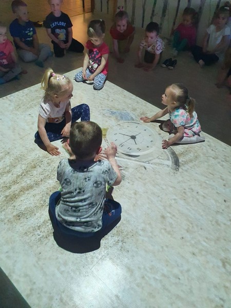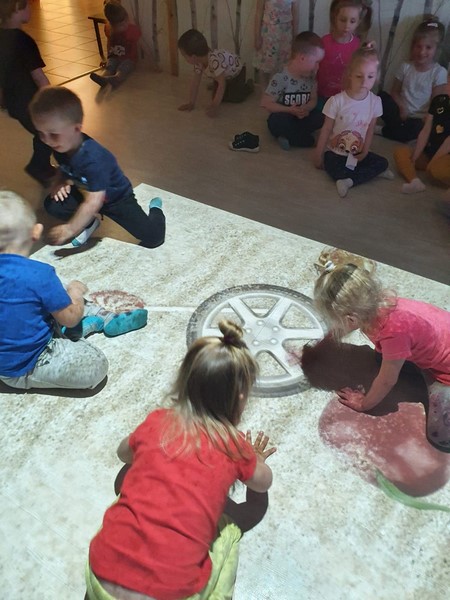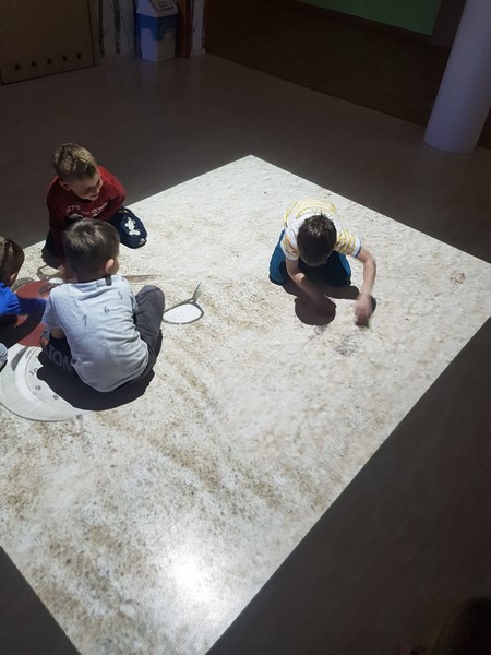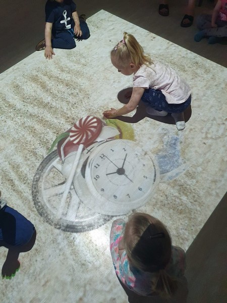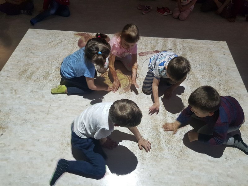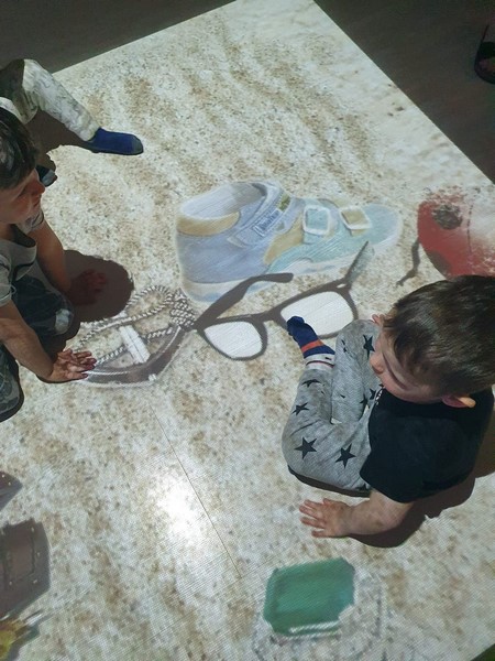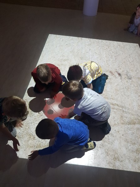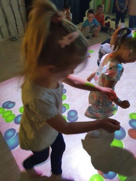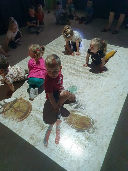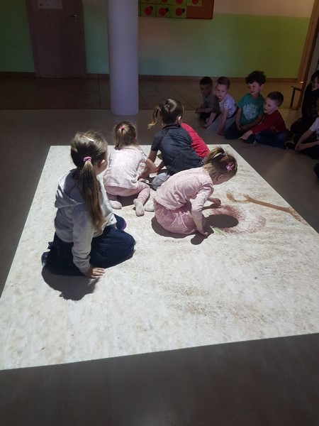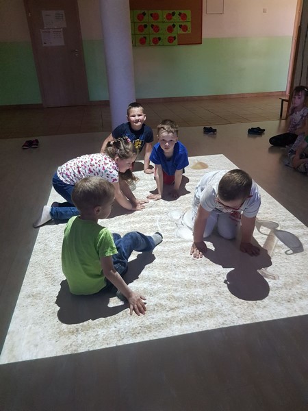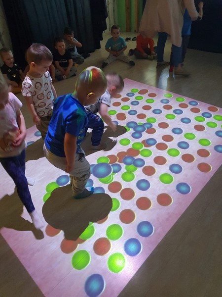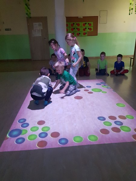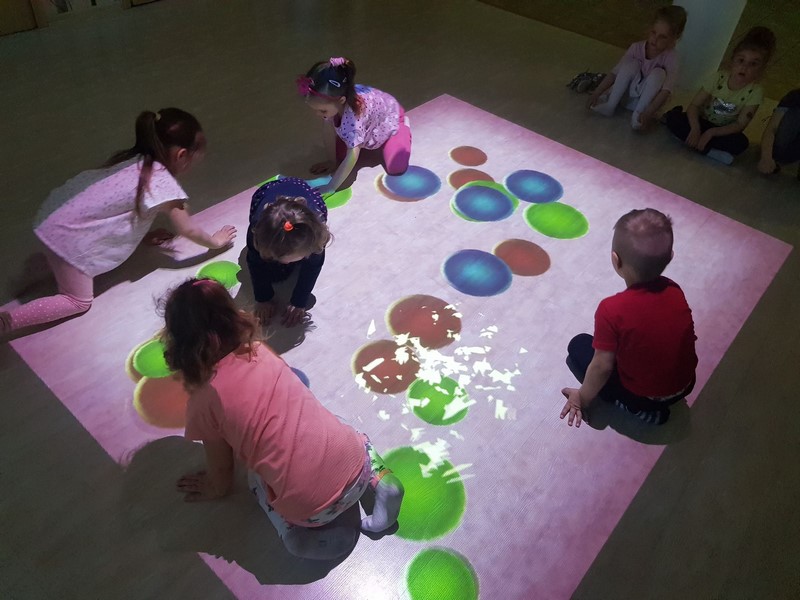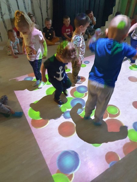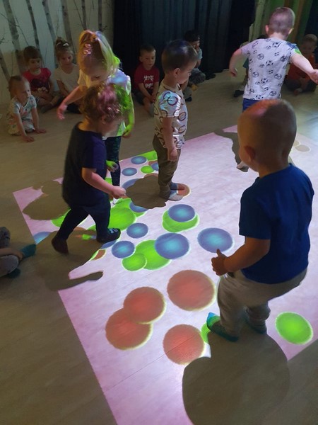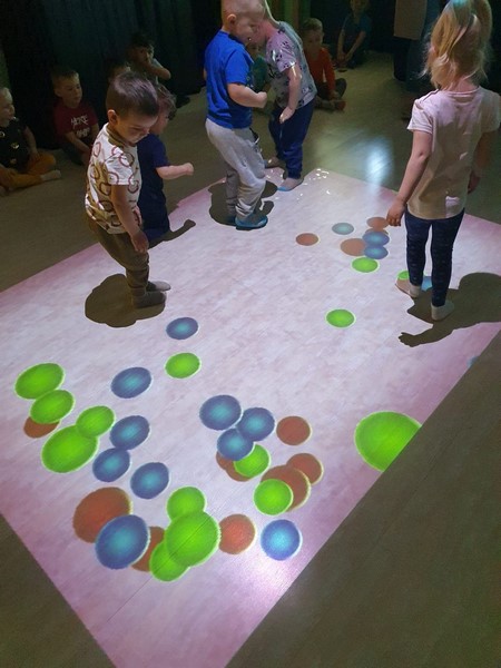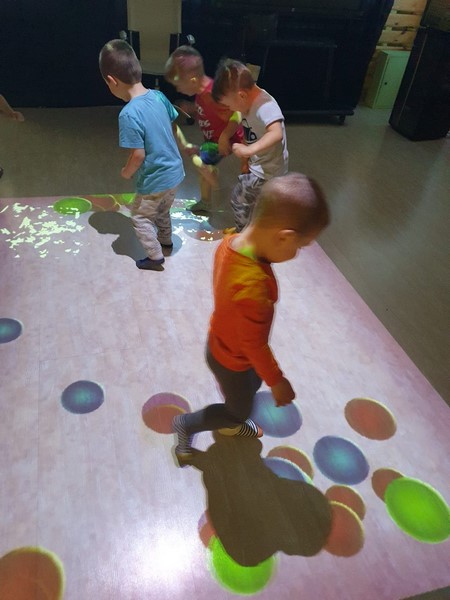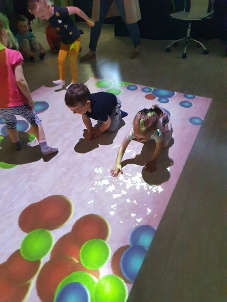 Przedszkolaki z różnych grup chętnie korzystają z podłogi interaktywnej na języku angielskim. Powtarzają kolory i szukają skarbów.