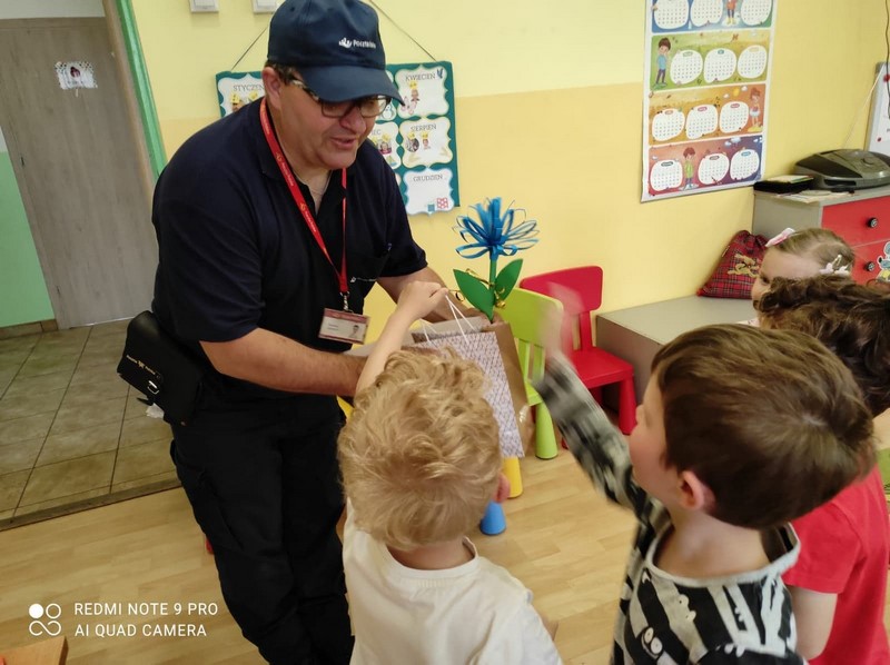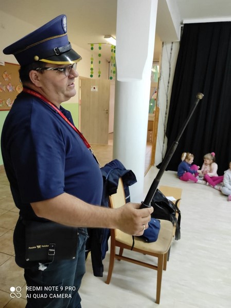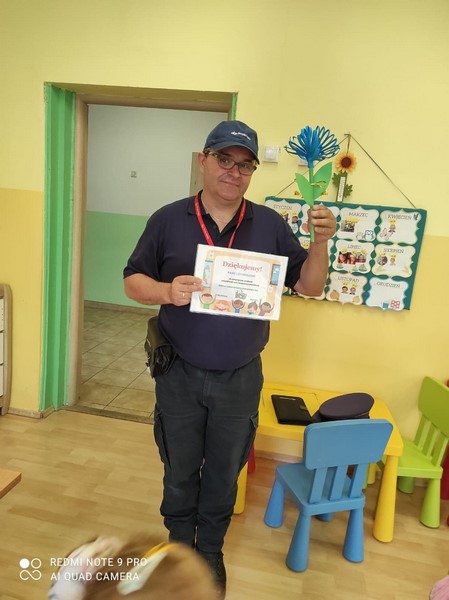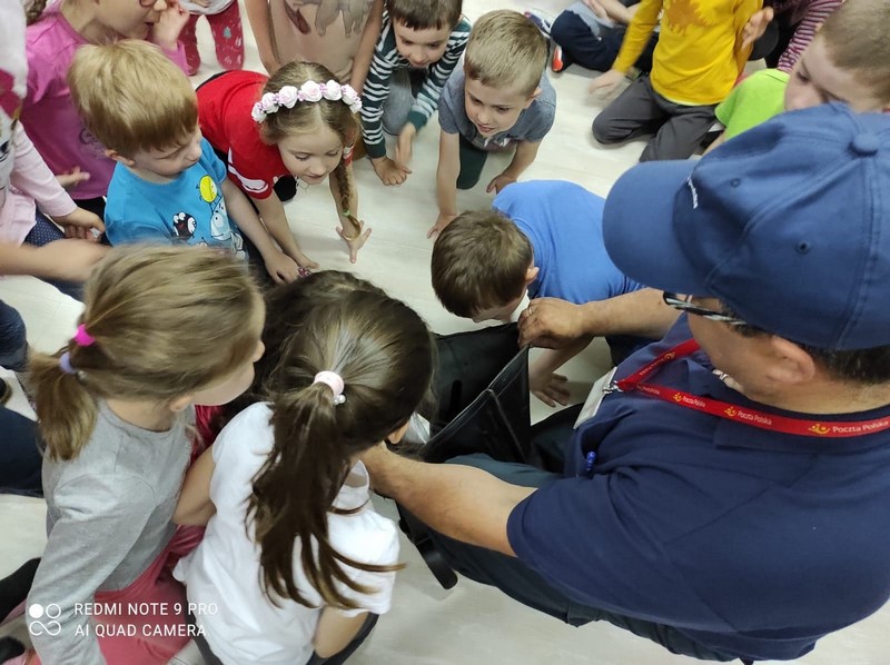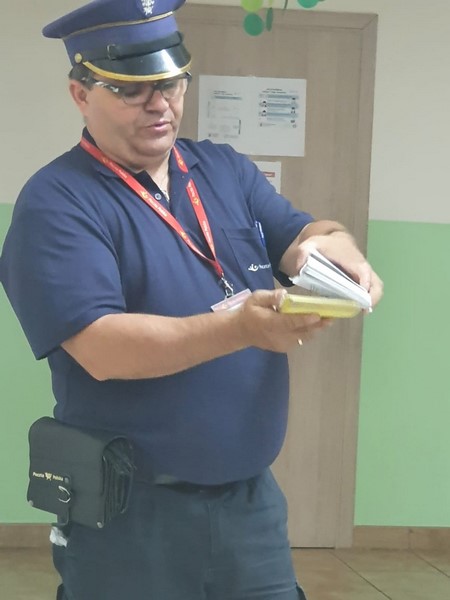 Listonosz Grzegorz odwiedził nasze przedszkole 25 maja nasze dzieci poznały specyfikę pracy listonosza. Zaproszony gość opowiedział o swojej pracy, zadaniach, trudzie ale i przyjemniej stronie swojego zawodu, np. spotkaniu z dziećmi. Pan Grzegorz zaprezentował przedszkolakom wyposażenie swojej torby listonosza, pokazał druki, znaczki i urządzenia z których korzysta na co dzień. Poza tym przyniósł dla dzieci specjalną przesyłkę, która bardzo zaintrygowała naszych przedszkolaków, a była to paczka pełna cukierków... Wizyta tak specjalnego gościa stała się inspiracją dla 6-latkow, wykonali oni piękne prace plastyczne z listonoszem w roli głównej, natomiast młodsze dzieci po obiedzie obejrzały bajkę "Listonosz Pat", do obejrzenia której zachęcał nas gość. Przedszkolaki odwdzięczyły się listonoszowi skromnym dyplomem i kwiatkiem. Bardzo dziękujemy Panu Grzegorzowi za poświęcony czas i przybliżenie nam swojego zawodu.
