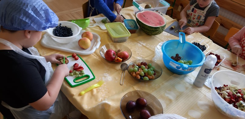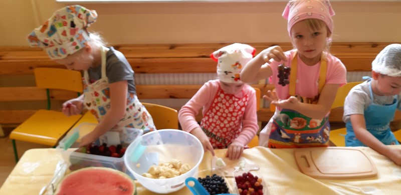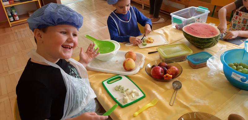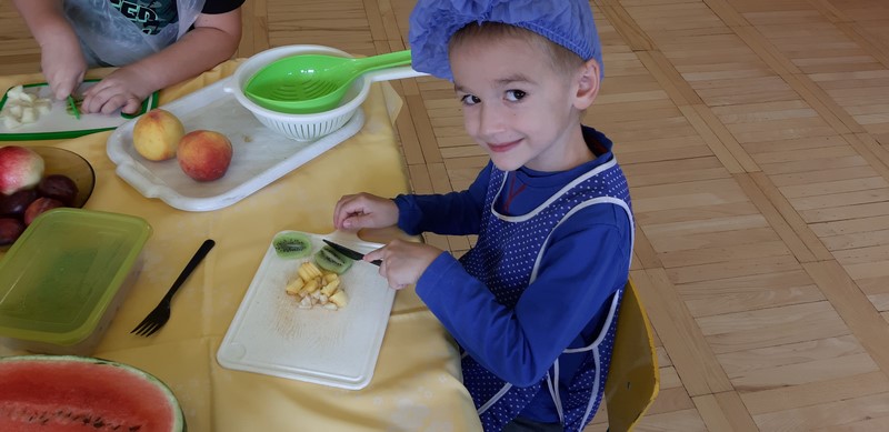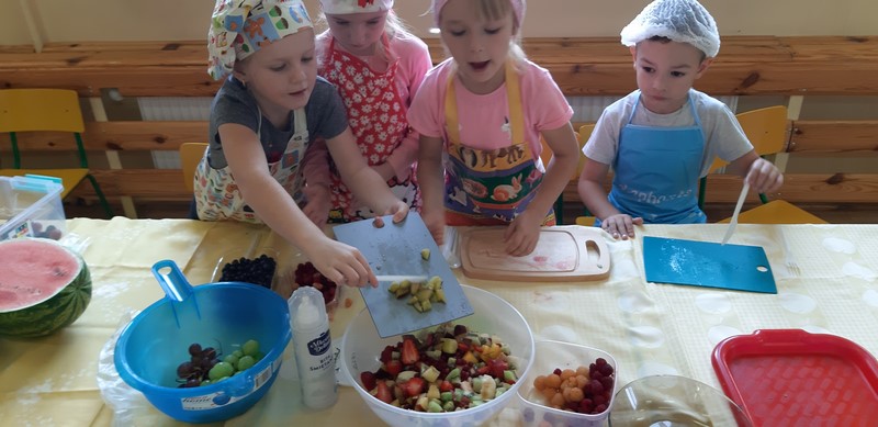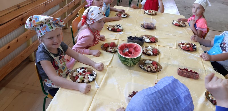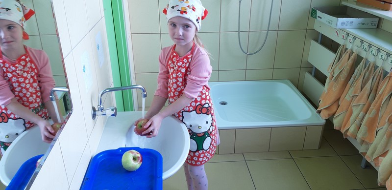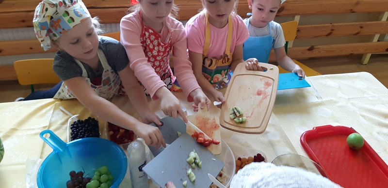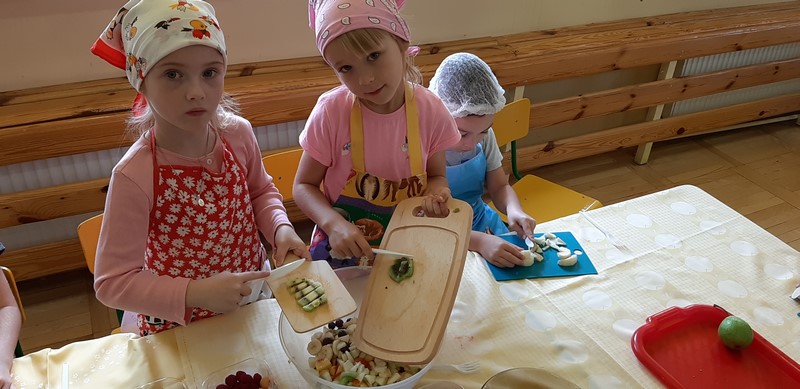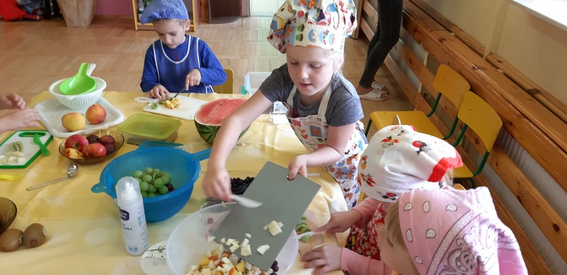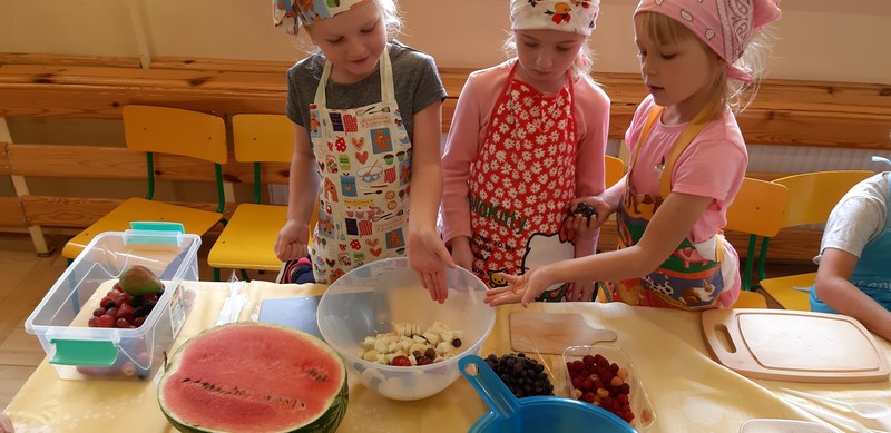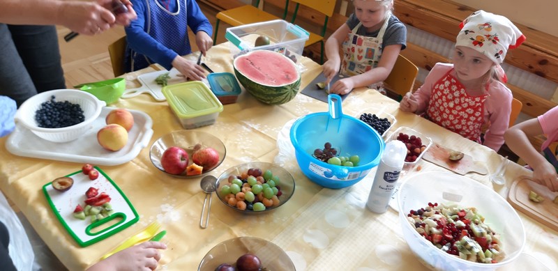 Jesienią jest wiele owoców. Dużo rozmawiały o owocach czyli skąd się je pozyskuje i w jaki sposób. Rysowały nawet sad. Dzieci wiedzą że są one bardzo zdrowe dlatego wykonały sałatkę owocową. Najpierw umyły ręce później owoce i zrobiły super sałatkę, którą jadły ze smakiem.