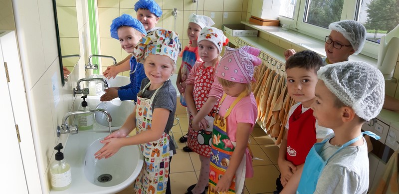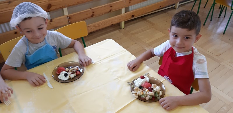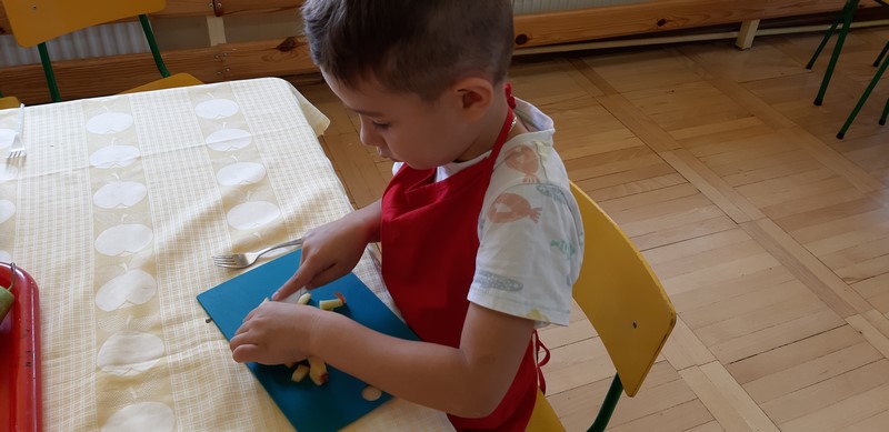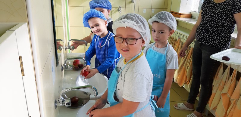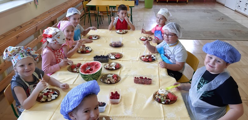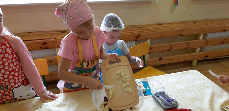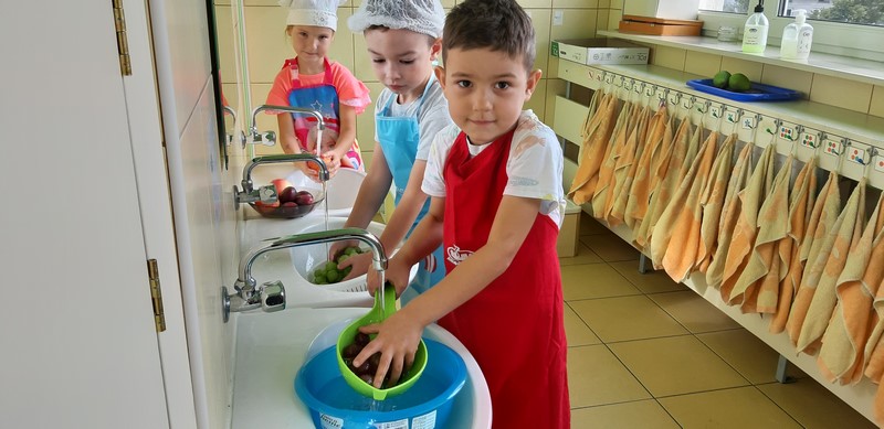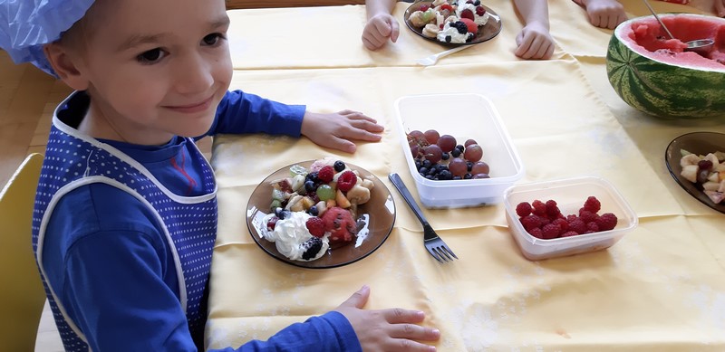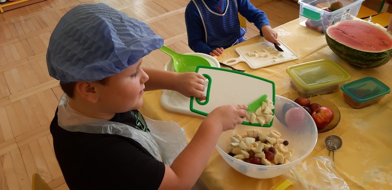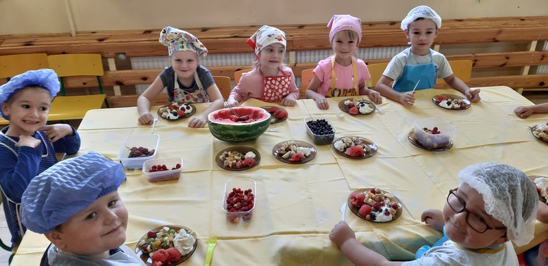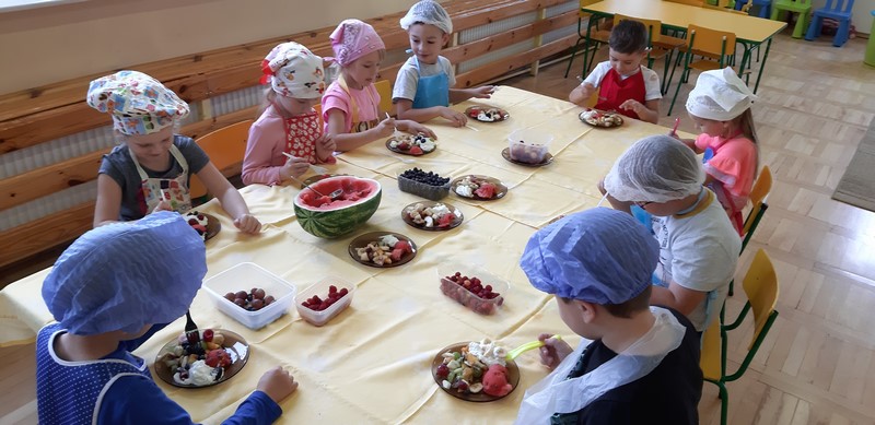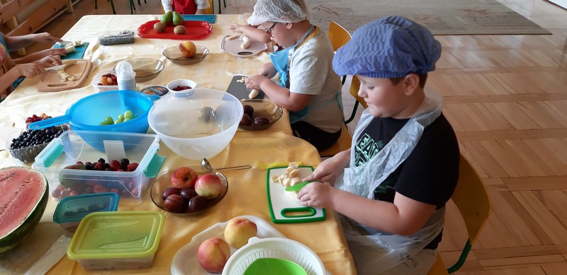 Jesienią jest wiele owoców. Dużo rozmawiały o owocach czyli skąd się je pozyskuje i w jaki sposób. Rysowały nawet sad. Dzieci wiedzą że są one bardzo zdrowe dlatego wykonały sałatkę owocową. Najpierw umyły ręce później owoce i zrobiły super sałatkę, którą jadły ze smakiem.