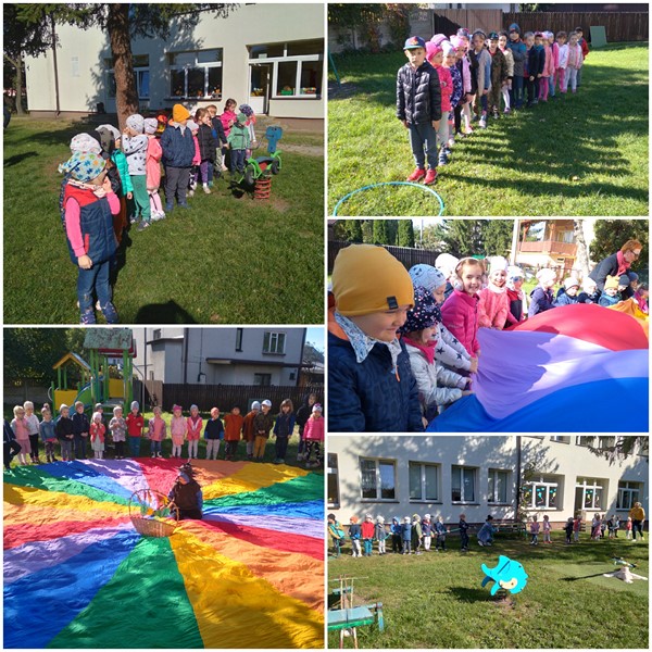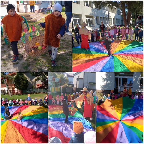 Dzieci z naszego przedszkola świętowały przyjście kolejnej pory roku, jaką jest jesień. Niespodzianką był fakt, że odwiedziła nas sama Pani Jesień. Z koszem pełnym jesiennych darów oraz towarzyszący jej pomocnicy: 2 wiewióreczki i mały jeżyk, wypełniły naszym dzieciom miło czas. Pani Jesień pokazała przedszkolakom dary, jakie że sobą przyniosła. Były wspólne piosenki, konkurencje sportowe oraz zabawy. „Misie” ochoczo bawiły się na placu zabaw. „Tygryski” przeciągały linę (dziewczynki kontra chłopcy), "Motylki" oraz "Jeżyki" także rywalizowały w tej konkurencji. Każdy przedszkolak z wielkim zapałem brał udział w kolejnym zadaniu. Na koniec, już w sali, przedszkolaki mogły pokazać, jak widzą jesień, malując kontury liści barwami jesieni.