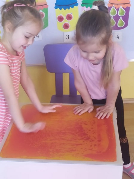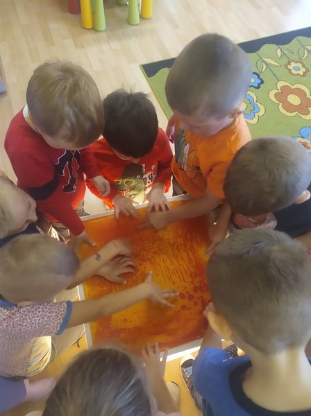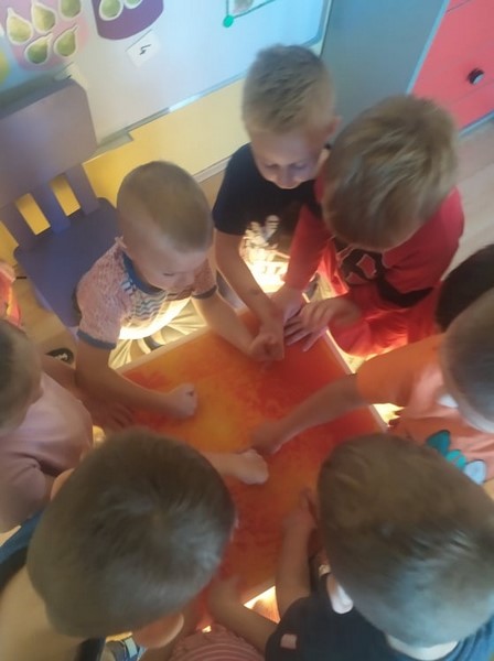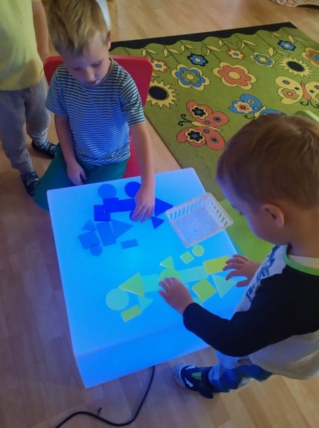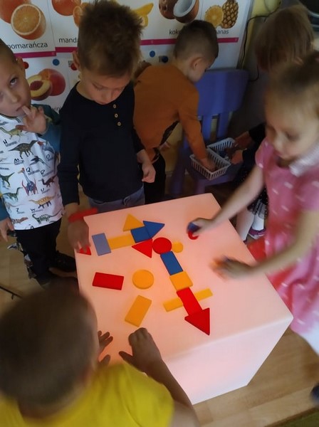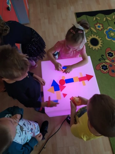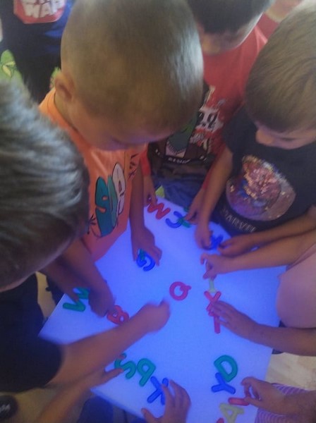 Smerfy bardzo lubią pracować ze świecącą kostką. Dzięki niej chętniej poznają litery, układają różne wyrazy (zazwyczaj są to imiona), a największa radość jest wtedy gdy zmieniają się kolory. Dzięki różnym nakładkom wykorzystujemy kostkę do zabaw sensorycznych.