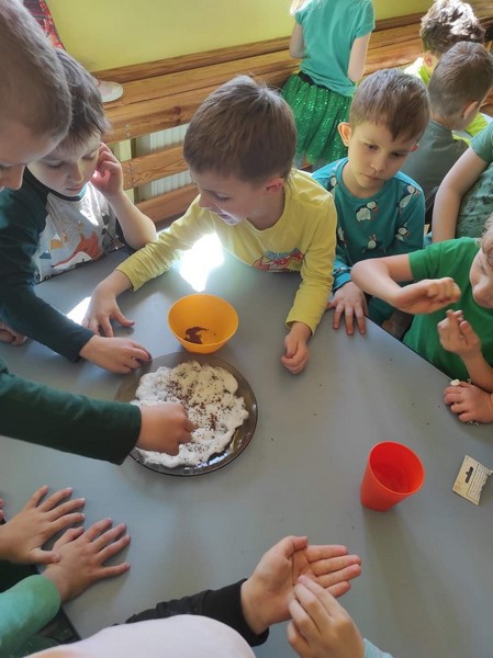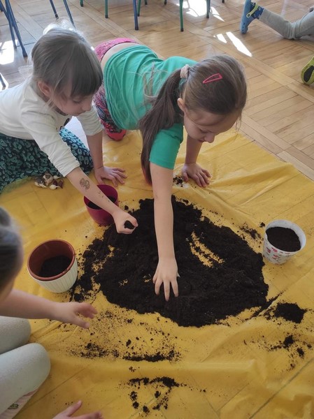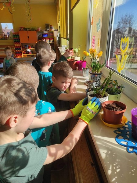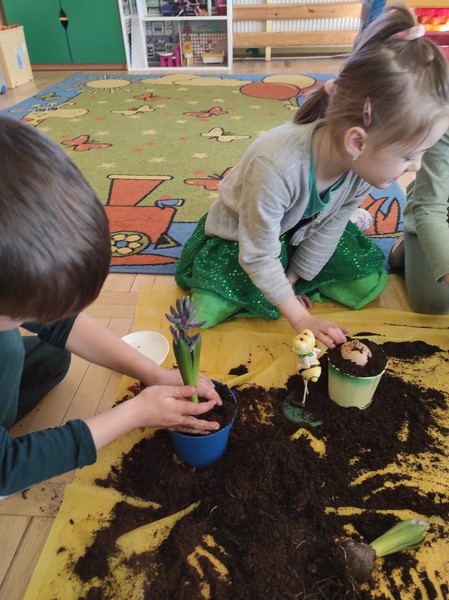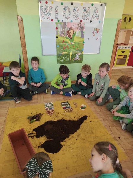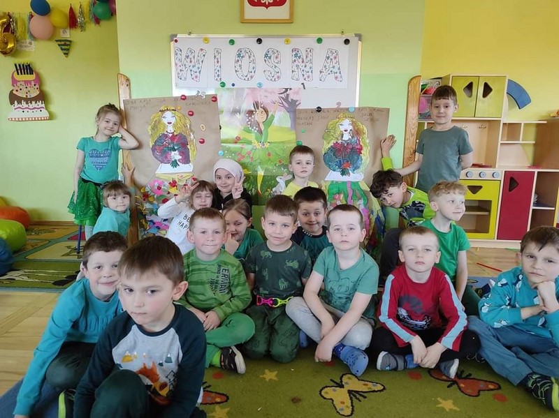 Pierwszy Dzień Wiosny. W tym dniu przedszkolaki ubrały się na zielono, uczestniczyły w przeróżnych zajęciach o tematyce wiosennej. Przed południem wyszliśmy na przedszkolny plac, aby pożegnać zimę w postaci Marzanny a przywitać piękna, ciepłą i słoneczną Wiosnę. Dzieci z grupy SKRZATY uczciły ten dzień również wyjątkowo - założyliśmy nasz wiosenny ogródek i wykonaliśmy piękne prace plastyczne. Były też zabawy na świeżym powietrzu i rozmowy o zwiastunach Wiosny oraz pracy rolnika i ogrodnika.