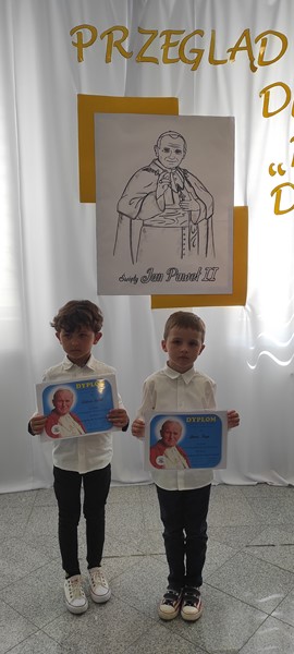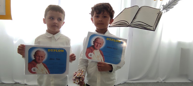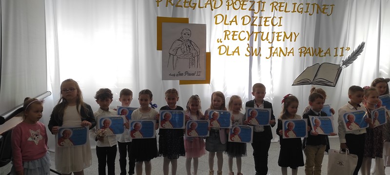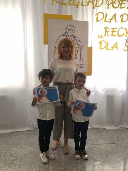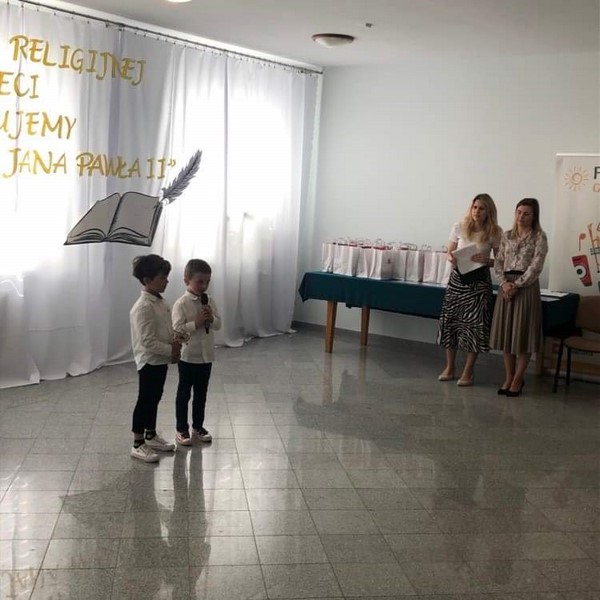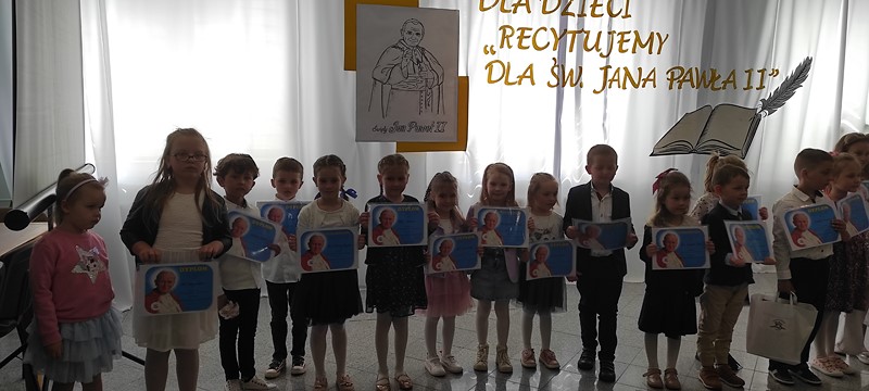 18 maja reprezentanci naszego przedszkola Leoś i Wiktorek z grupy "Skrzaty" wzięli udział w Przeglądzie Poezji Religijnej dla dzieci "Recytujemy dla Jana Pawła II". Chłopcy przygotowali wiersz A. Matusiak pt. "Karolek i stokrotki". Dziękuję rodzicom za pomoc i gratuluję chłopcom pięknego występu.