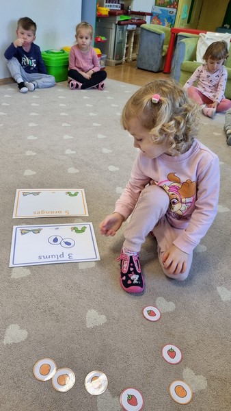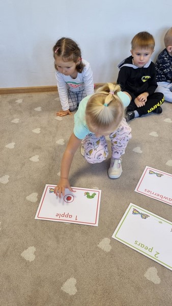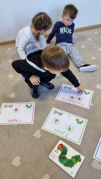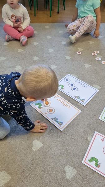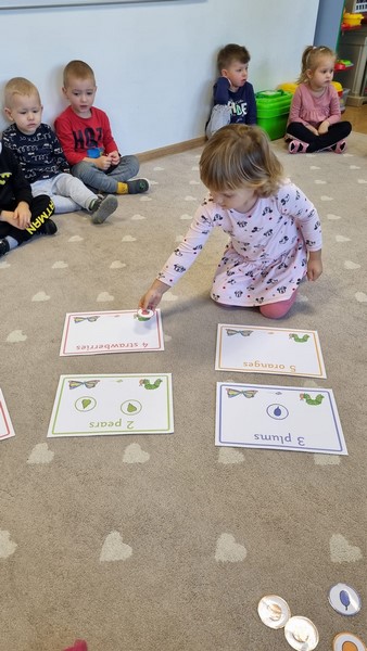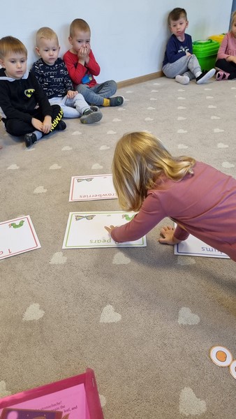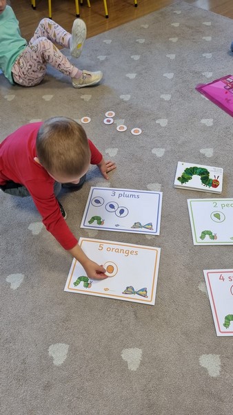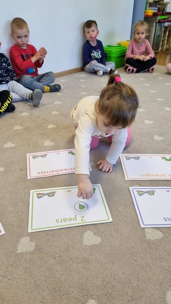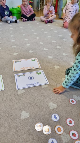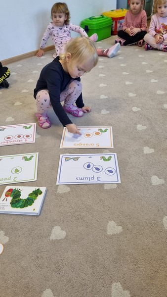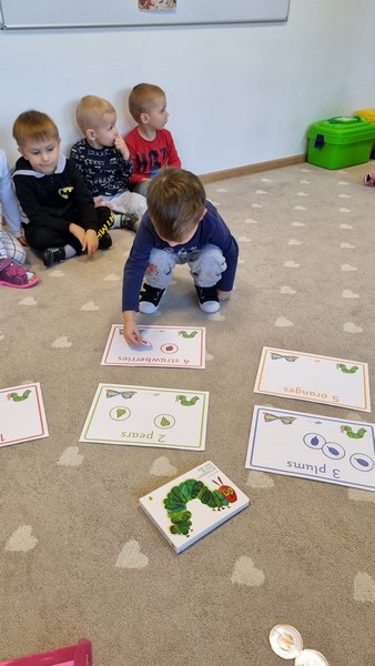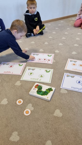 Na zajęciach z języka angielskiego Delfinki poznały historię bardzo głodnej gąsienicy (The very hungry caterpillar). Miały okazję poznać cykl rozwoju motyla oraz poćwiczyć liczenie w zakresie 1-5.