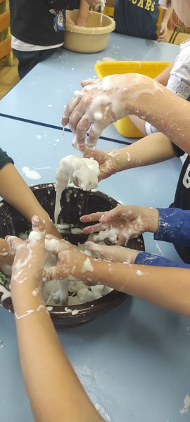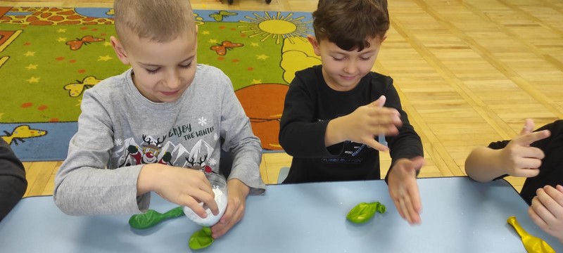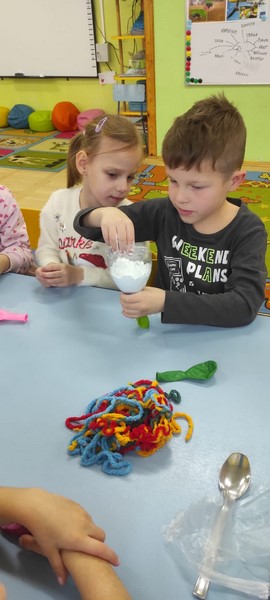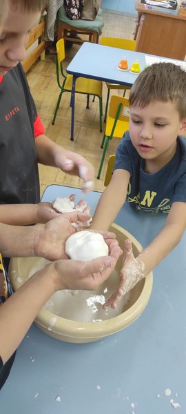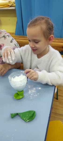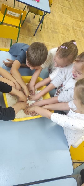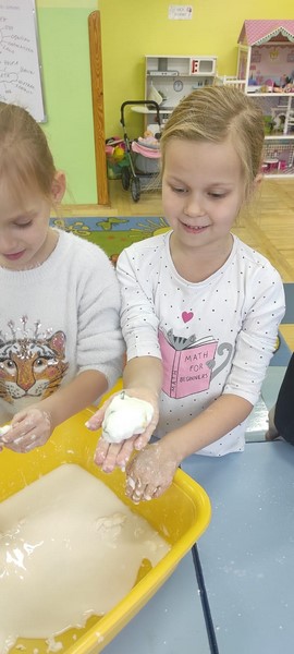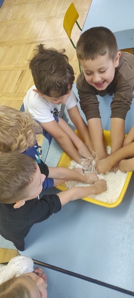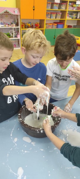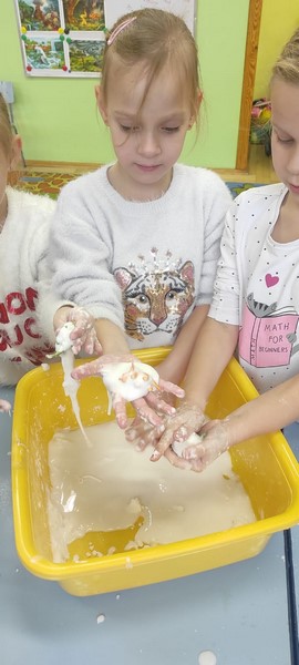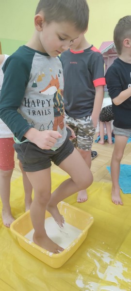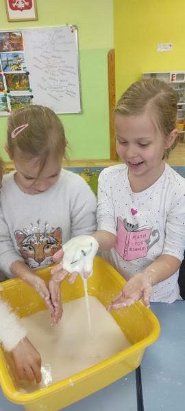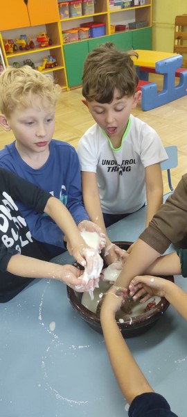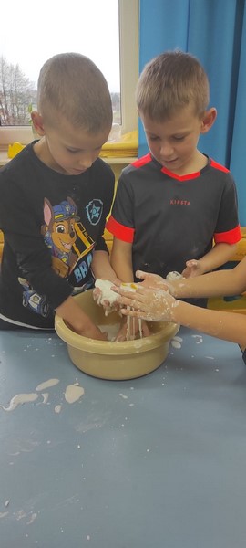 Kolejne zabawy SKRZATÓW gdzie pracowały stópki, rączki i oczka. Wczoraj robiliśmy gniotki, a dziś zabawy z cieczą nienewtonowską.