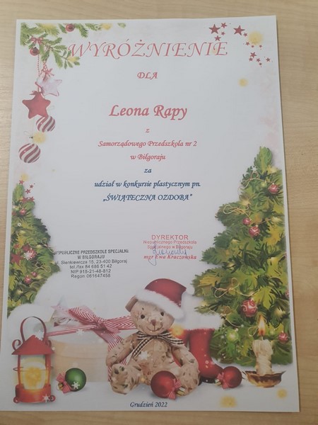 Laureaci konkursu plastycznego pt. ,,Swiateczna Ozdoba.'' zorganizowanego przez Niepubliczne Przedszkole Specjalne w Bilgoraju