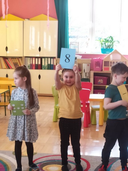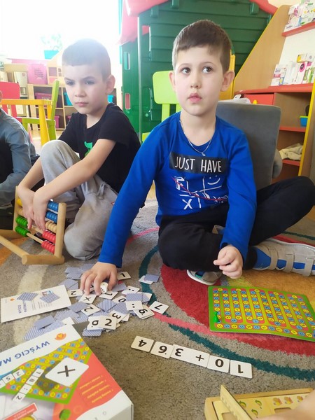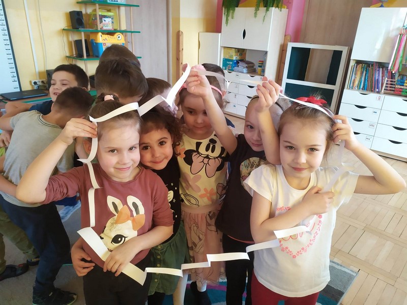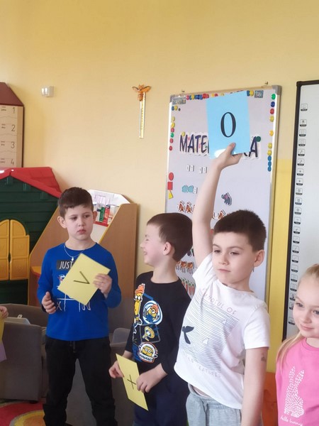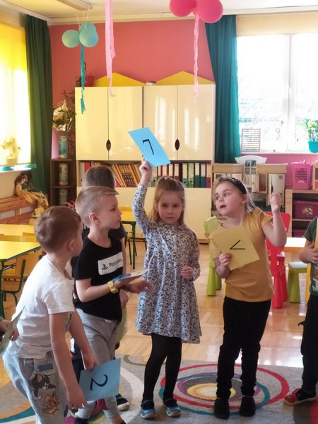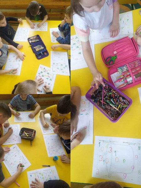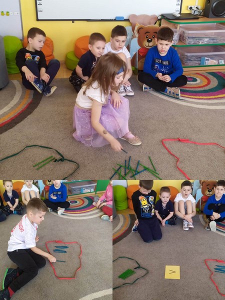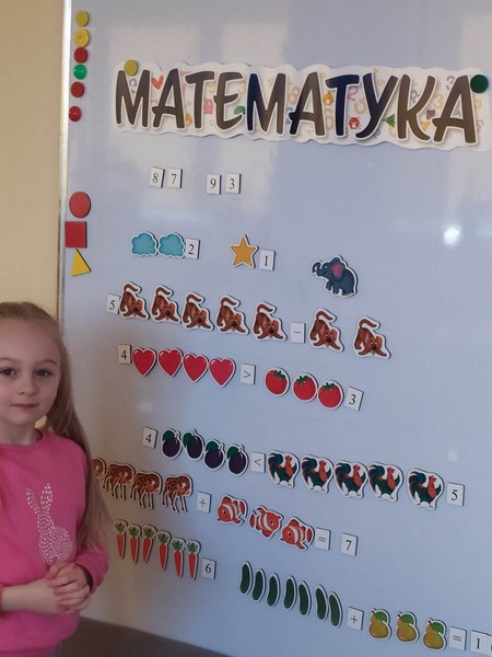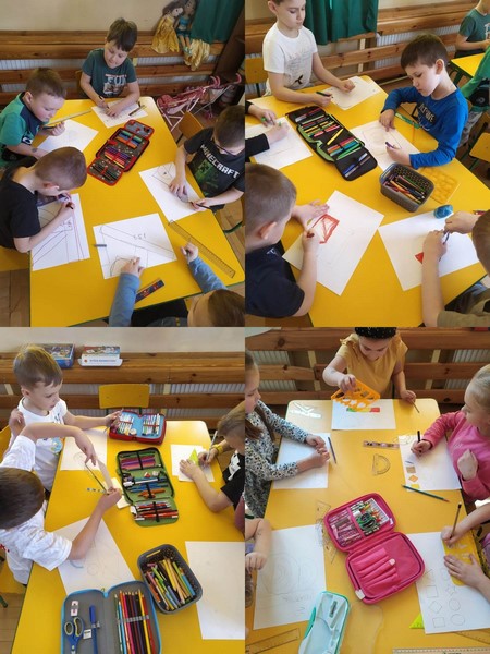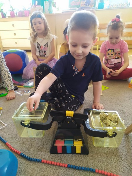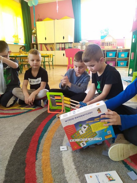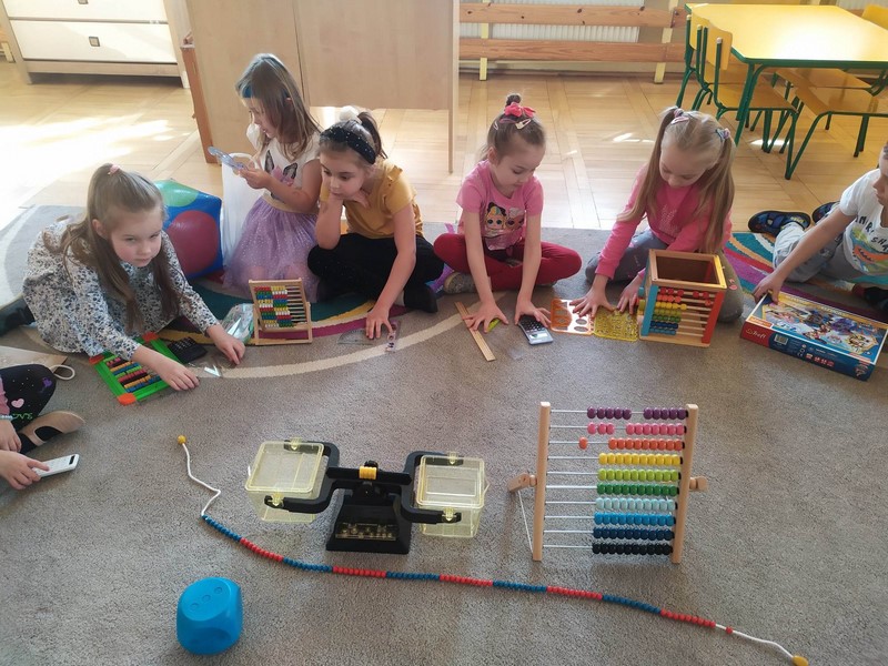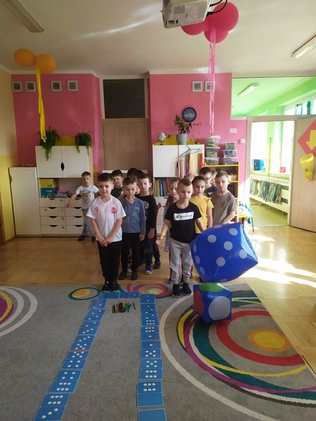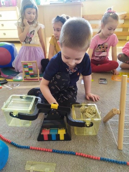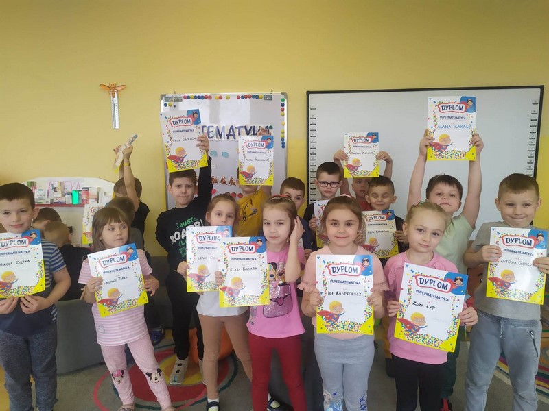Było dużo zabaw matematycznych, mierzenie, ważenie, liczenie, szacowanie. Graliśmy w gry matematyczne , rysowaliśmy za pomocą przyrządów geometrycznych. Wycięliśmy ogromną dziurę w prostokącie A4. Każdy otrzymał dyplom super matematyka.