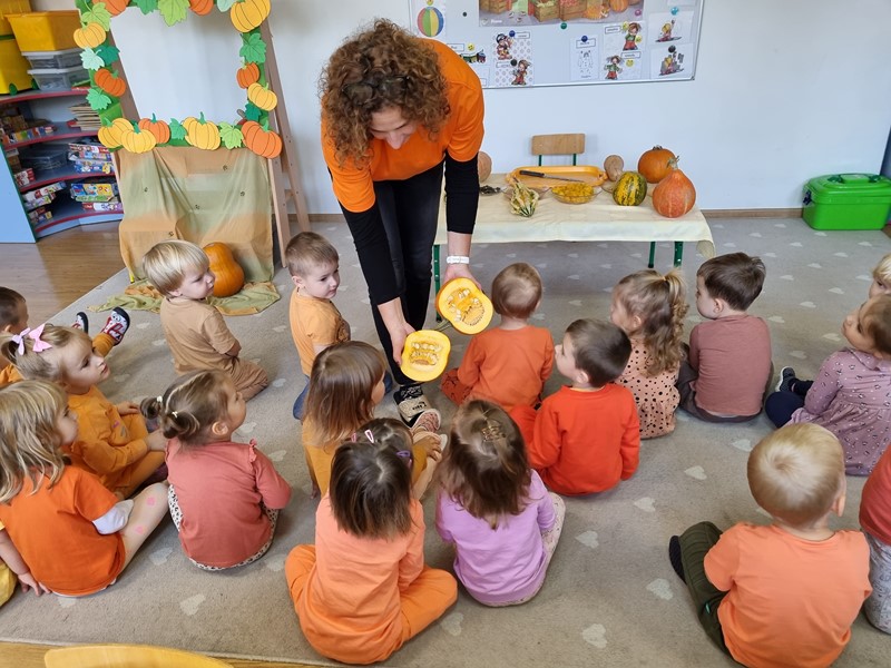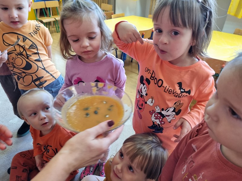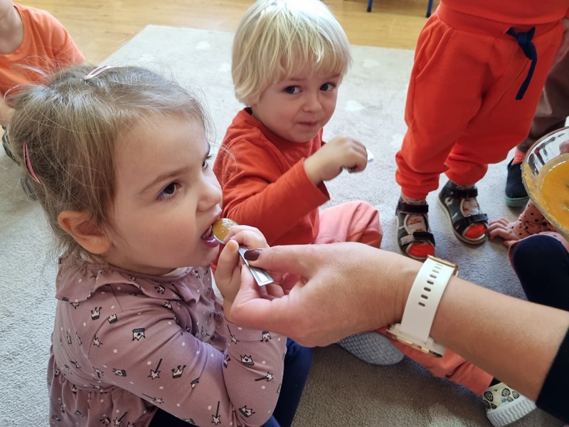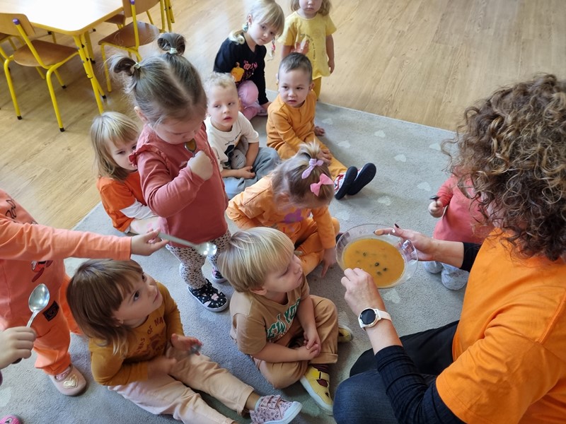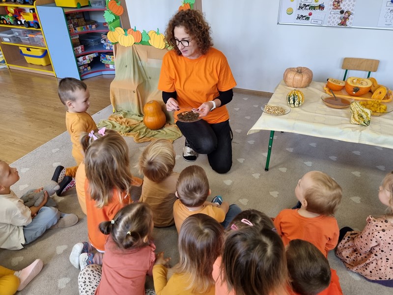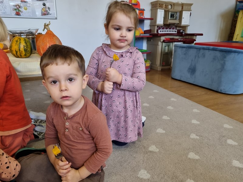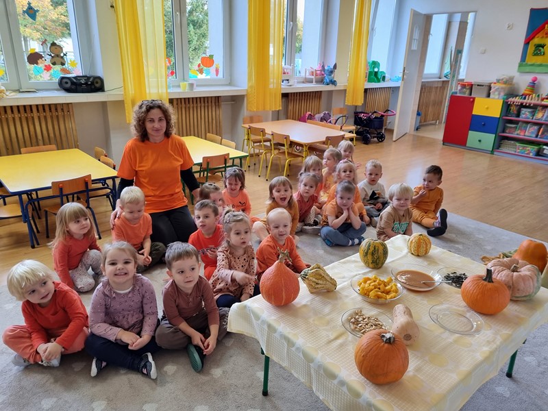 Dzisiaj w grupie "Motylki" królowała dynia Dana. Było smacznie, wesoło i pomarańczowo, a to za sprawą udziału w projekcie edukacyjnym promującym zdrowe nawyki żywieniowe "Witaminki".