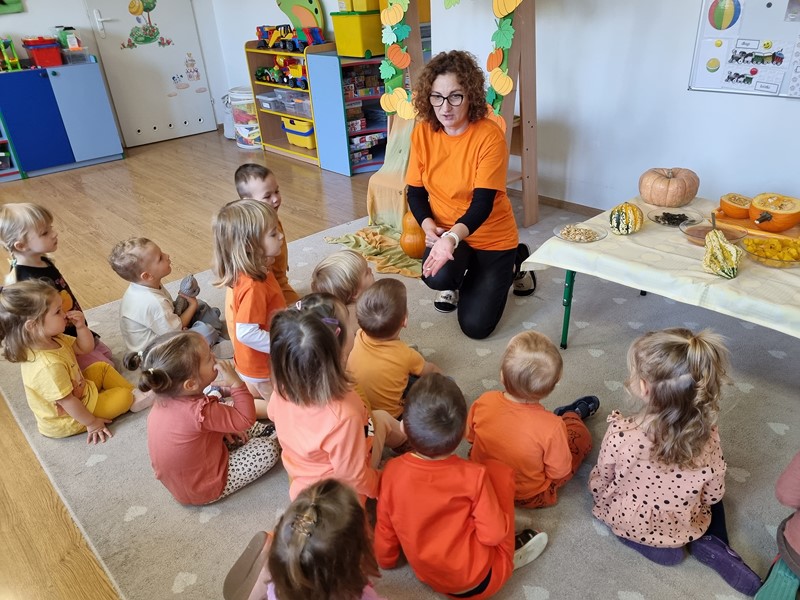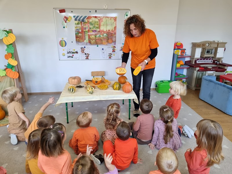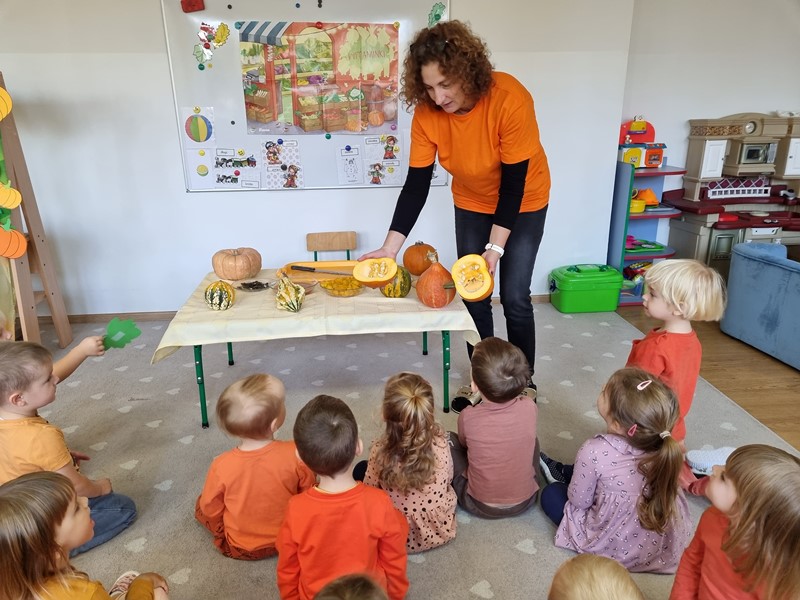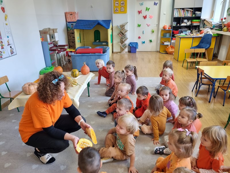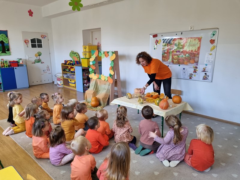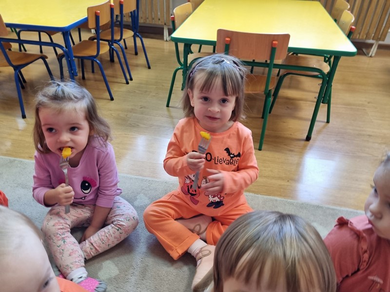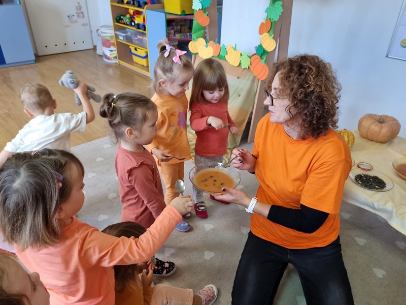 Dzisiaj w grupie "Motylki" królowała dynia Dana. Było smacznie, wesoło i pomarańczowo, a to za sprawą udziału w projekcie edukacyjnym promującym zdrowe nawyki żywieniowe "Witaminki".