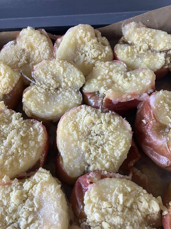 Dzisiaj na podwieczorek nasze panie kucharki przygotowały dla dzieci pyszne zapiekane jabłuszka pod pierzynką z kruszonki.