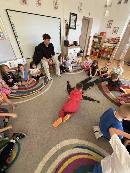 Podczas spotkania pan Damian opowiedział przedszkolakom o swojej pasji do pływania oraz o różnych stylach pływackich, które zaprezentował w ciekawy i przystępny sposób. Dzieci z ogromnym zaangażowaniem ćwiczyły razem z nim ruchy rąk i nóg, naśladując prawdziwego sportowca.