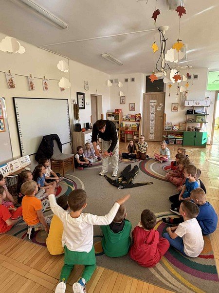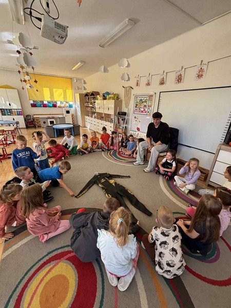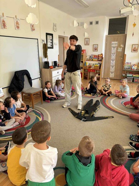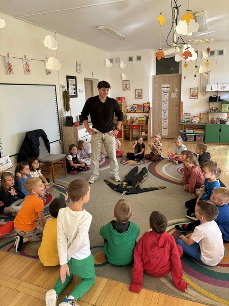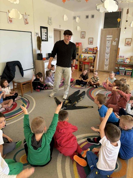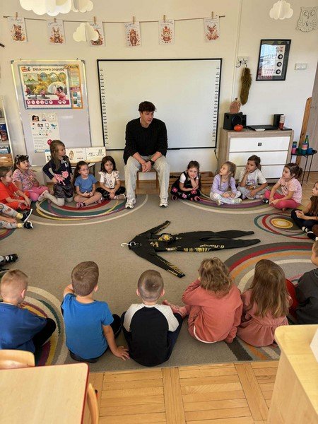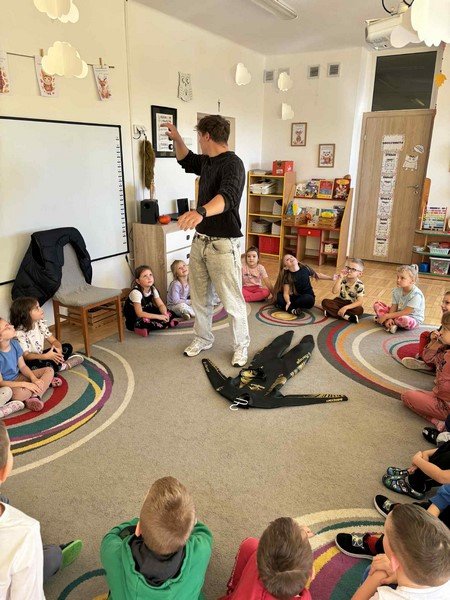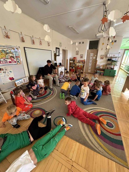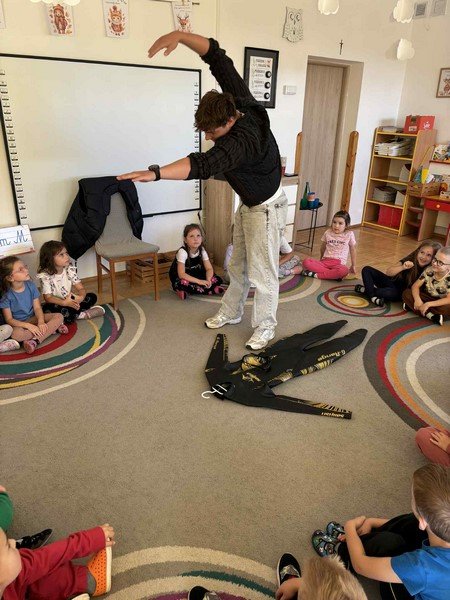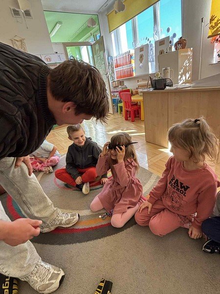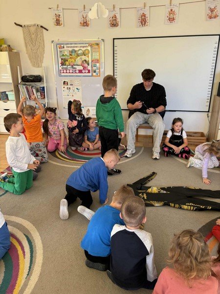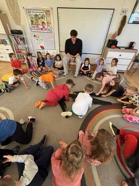 Z zaciekawieniem słuchały opowieści o niezwykłym wyczynie naszego gościa oraz o tym, jak wiele wytrwałości, odwagi i siły potrzeba, by pokonać tak długi dystans. Przedszkolaki miały też okazję zadawać panu Damianowi pytania, na które odpowiadał z uśmiechem i życzliwością.