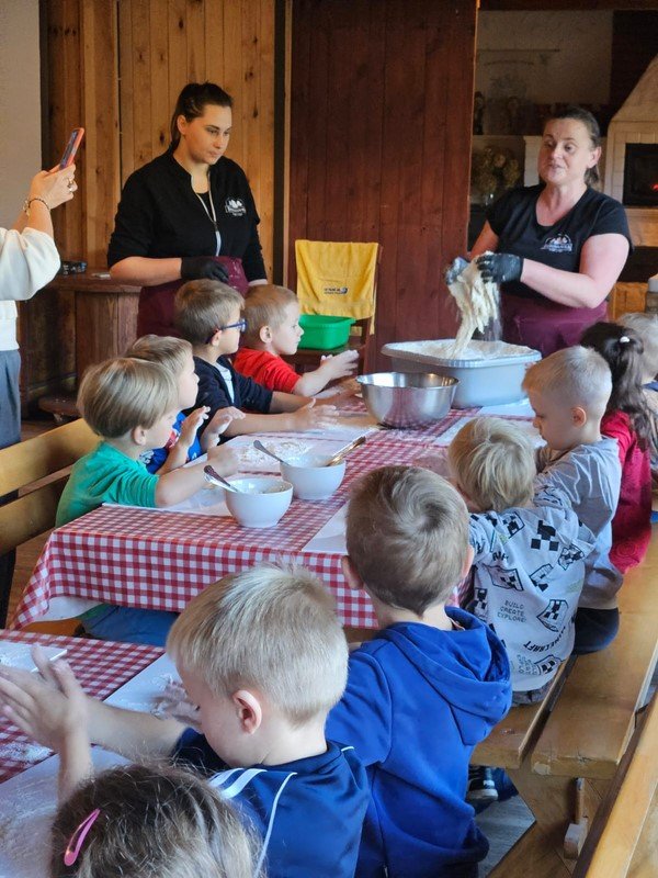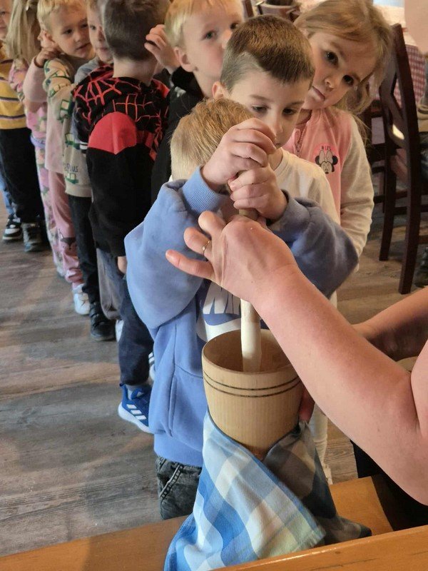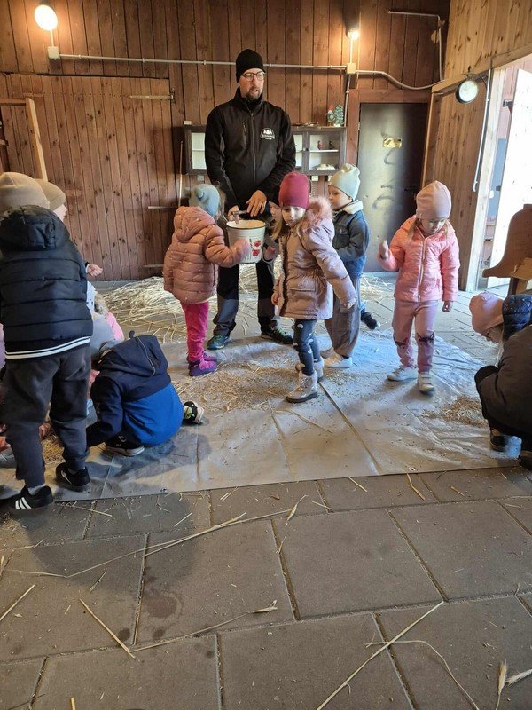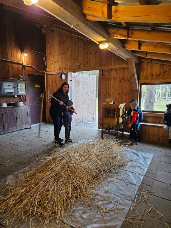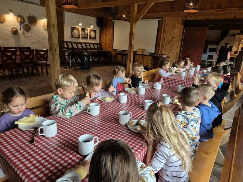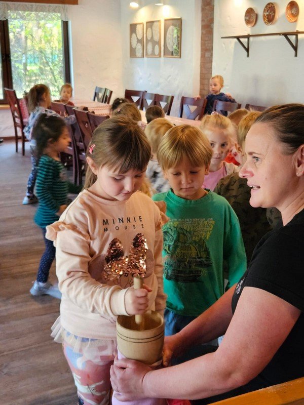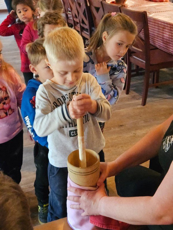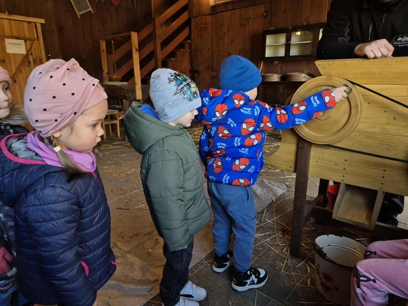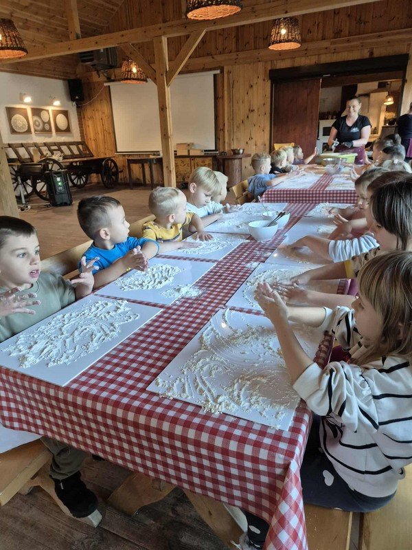 Przedszkolaki wzięły udział w warsztatach edukacyjnych „Od ziarenka do bochenka”. Ciekawą atrakcją było własnoręczne młócenie zboża za pomocą cepów, przesiewanie go przez przetak i młynek, a następnie mielenie zboża w kamiennych żarnach. Dużo radości sprawiło formowanie własnych chlebków oraz ubijanie i degustacja masła. Po warsztatach dzieci miały okazję zobaczyć oraz nakarmić zwierzęta znajdujące się w gospodarstwie. Pomimo, że dzień ten był bardzo intensywny, wszyscy wrócili do przedszkola pełni pozytywnych wrażeń.