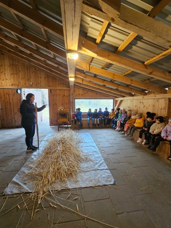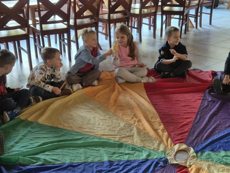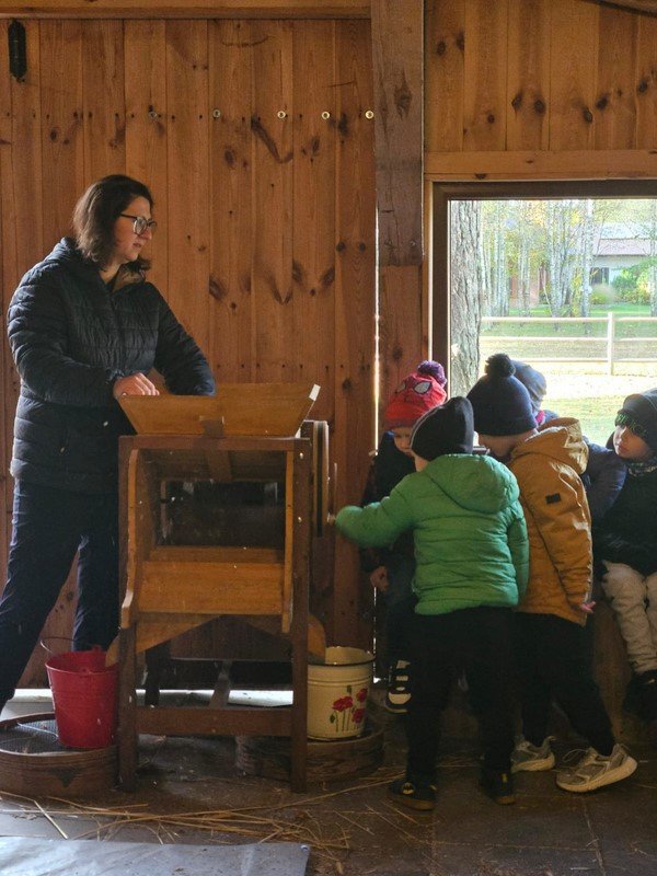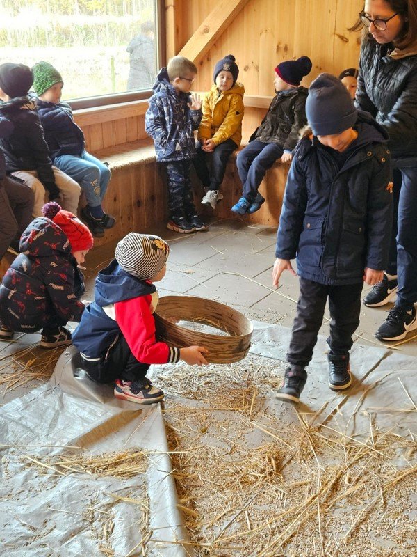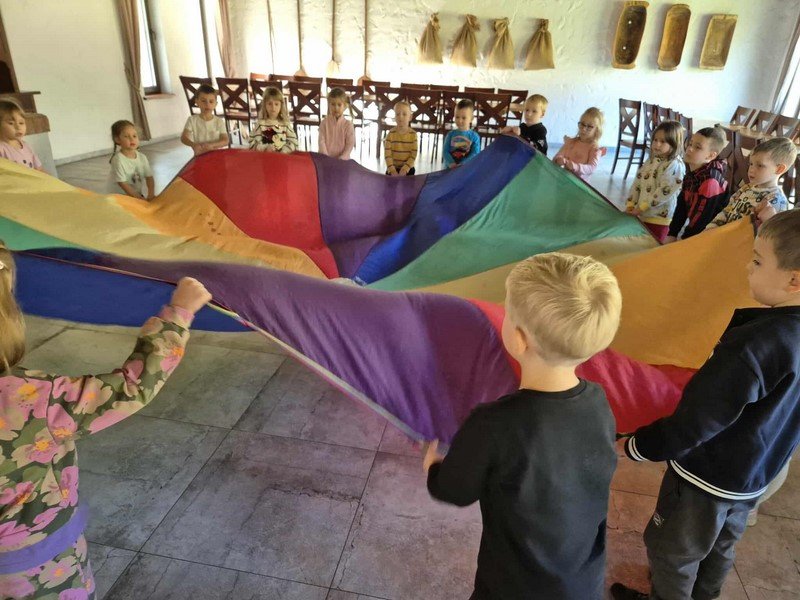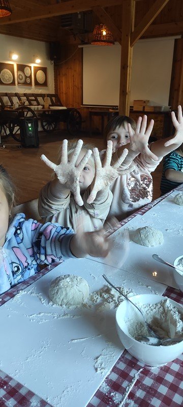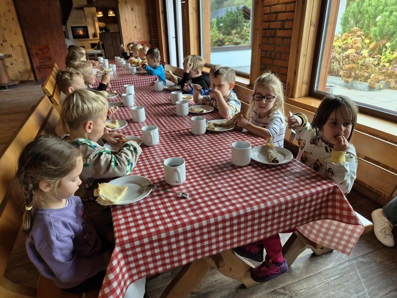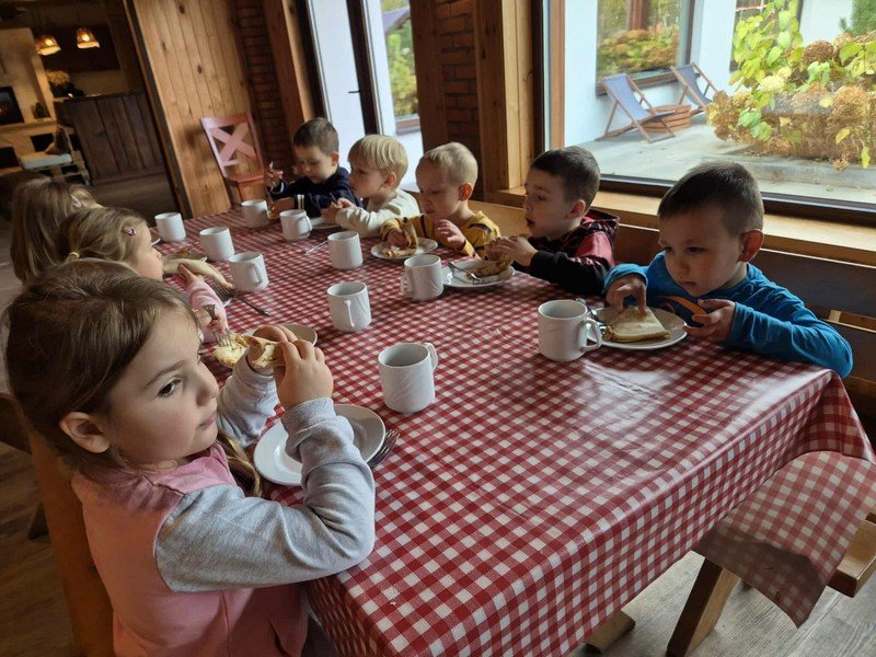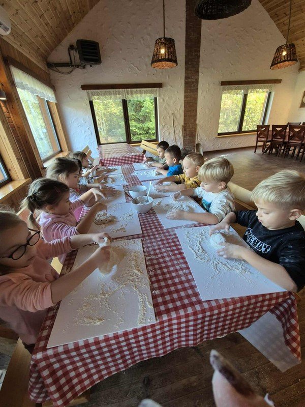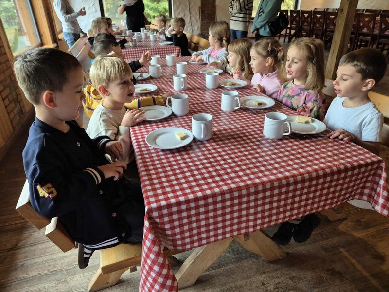 Przedszkolaki wzięły udział w warsztatach edukacyjnych „Od ziarenka do bochenka”. Ciekawą atrakcją było własnoręczne młócenie zboża za pomocą cepów, przesiewanie go przez przetak i młynek, a następnie mielenie zboża w kamiennych żarnach. Dużo radości sprawiło formowanie własnych chlebków oraz ubijanie i degustacja masła. Po warsztatach dzieci miały okazję zobaczyć oraz nakarmić zwierzęta znajdujące się w gospodarstwie. Pomimo, że dzień ten był bardzo intensywny, wszyscy wrócili do przedszkola pełni pozytywnych wrażeń.