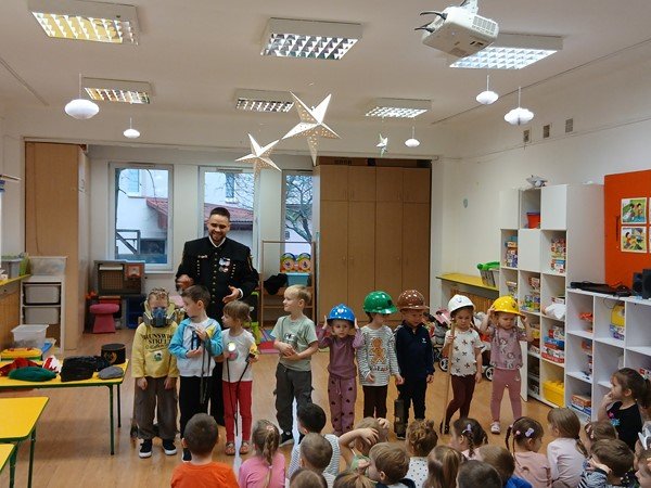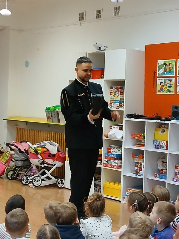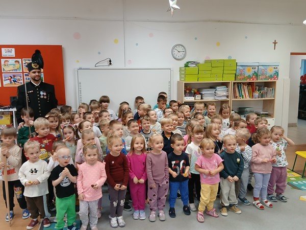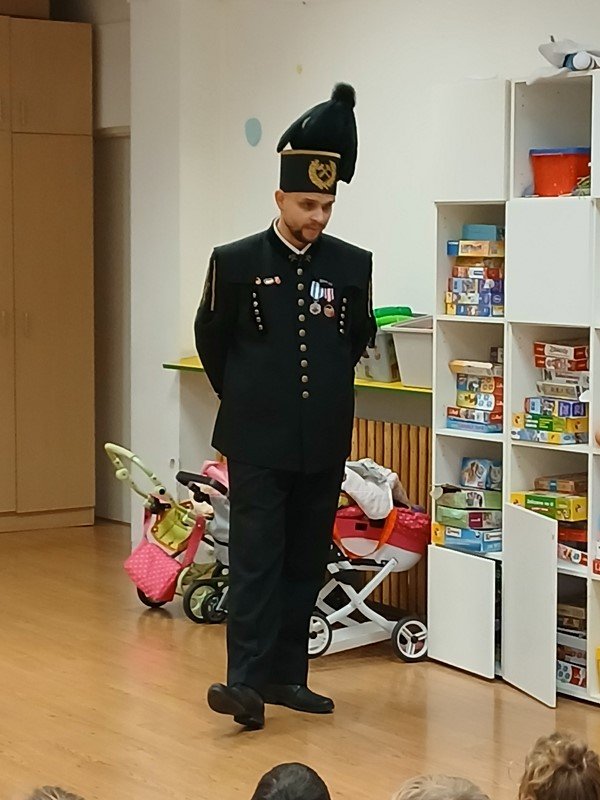 Dowiedziały się, w jaki sposób wydobywany jest węgiel oraz jak bardzo jest nam potrzebny w codziennym życiu. Górnik przybył do nas w stroju galowym, dlatego dzieci miały okazję przyjrzeć się z bliska mundurowi, czapce górniczej, odznaczeniom, które górnicy otrzymują za długoletnią, ciężką pracę w kopalni. Pan Artur wyjaśnił dzieciom, jakie znaczenie mają kolory pióropuszy na czapce i kto je nosi. Przedszkolaki chętnie i z zaciekawieniem wysłuchały opowieści. W trakcie wizyty zadawały wiele pytań, na które gość chętnie odpowiadał.