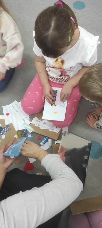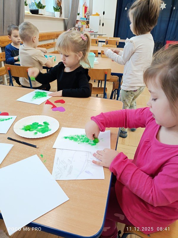 „Przedszkolaki z radością i zaangażowaniem wykonały kartki świąteczne dla seniorów z Domu Kombatanta i do Domu Pomocy Społecznej. Celem działania było rozwijanie empatii, wrażliwości oraz kształtowanie postaw życzliwości wobec innych.
