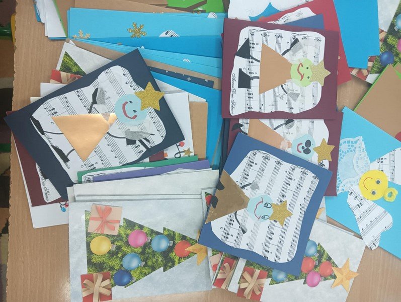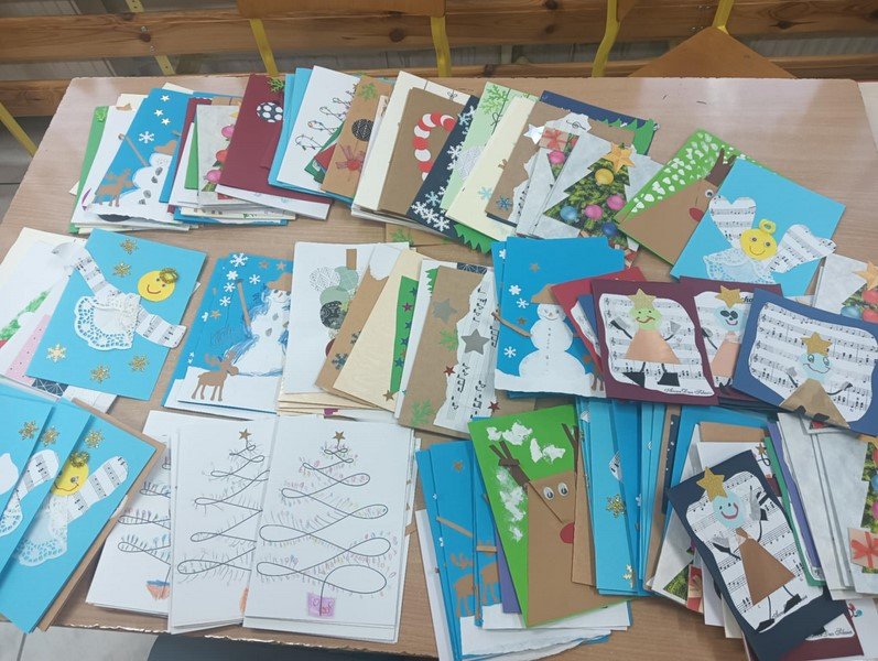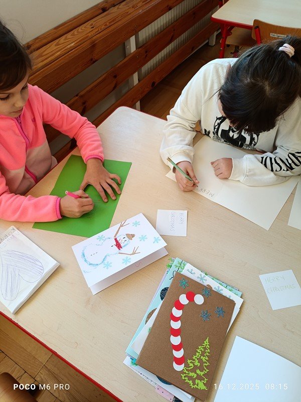 Kartki zostały przygotowane zarówno dla seniorów, jak i w ramach wymiany kartek świątecznych z języka angielskiego, podczas której dzieci utrwalały poznane słownictwo i zwroty związane ze świętami Bożego Narodzenia.