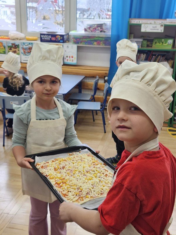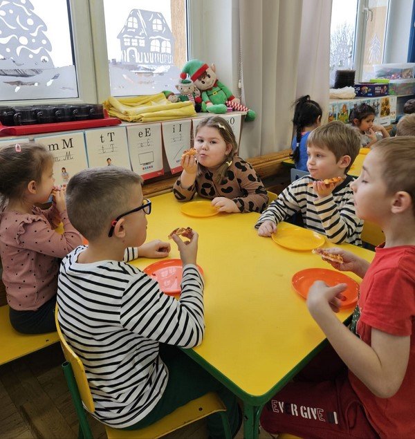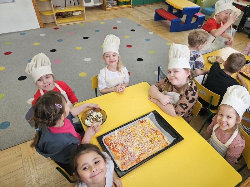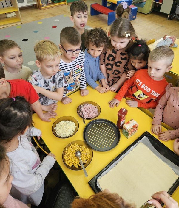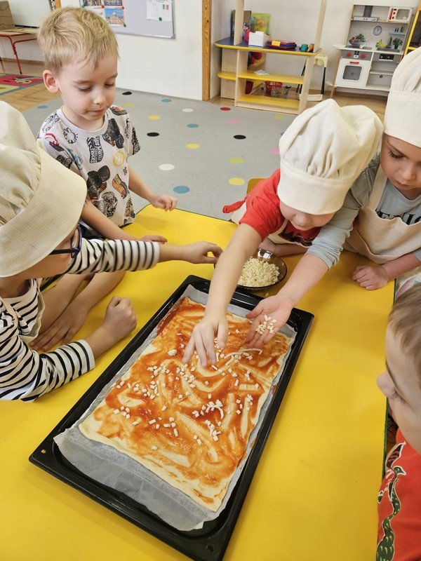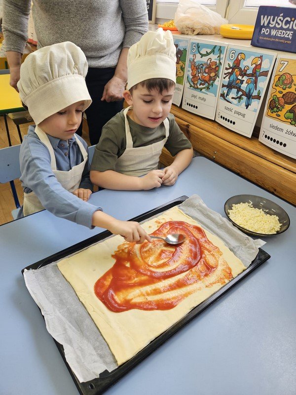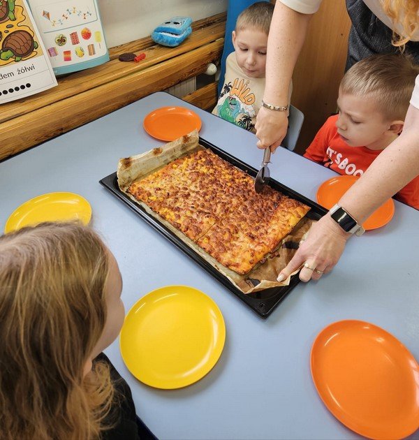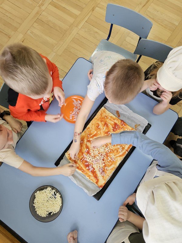 Szukaliśmy Włoch na mapie Europy, poznaliśmy niektóre włoskie słowa, muzykę oraz inne tradycyjne potrawy tego kraju. Dzieci zatańczyły pizzowy taniec, dobierały produkty do swojej pizzy, którą wypiekały w piecu na niby . Na zakończenie zajęć Skrzaty w grupach wykonały pizzę, którą następnie degustowaliśmy.