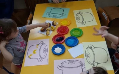 Ziemniaki można nie tylko gotować, ale także można z nich wyczarować kolorowe pieczątki. Przekonały się o tym maluszki, ozdabiając nimi rysunek garnka. tygryskom bardzo spodobała się taka kolorowa zabawa, która była też okazją do ćwiczenia motoryki małej.