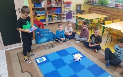W ramach tygodnia kodowania oraz zajęć z jezyka angielskiego dzieci z grupy Kotki miały okazję nauczyć się programować robota Photona.