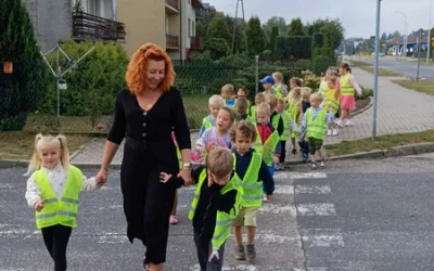 Skrzaty utrwalają w praktyce bezpieczne zachowania w ruchu drogowym oraz przypominają sobie znaczenie poznanych na zajęciach dydaktycznych znaków.