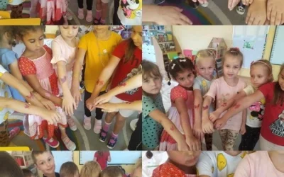 Dzień Przedszkolaka u Smerfów był pełen atrakcji. Zaczęliśmy od zabaw z chustą animacyjną. Było też malowanie na chuście naszych myśli i marzeń. Balansowaliśmy na deskach, skakaliśmy w workach. Robiliśmy tatuaże i wiele innych fajnych rzeczy . To był bardzo mile spędzony dzień.