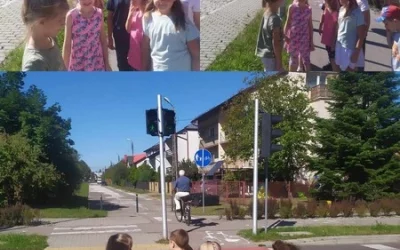 Smerfy wybrały się na skrzyżowanie aby przypomnieć sobie zasady jakie obowiązują podczas spacerów i przechodzenia przez ulicę napadach ze światłami i bez. Przypomnieliśmy sobie co oznaczają niektóre znaki drogowe. Po powrocie do przedszkola wykonaliśmy makietę na temat "Moja droga do przedszkola".