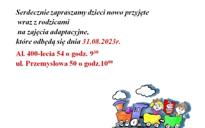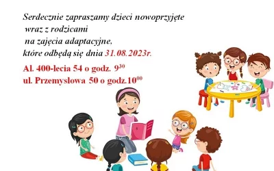 Za chwilę rozpoczynamy nowy rok szkolny. Dzisiaj, tj. 31 sierpnia, nowo przyjęte dzieci odwiedziły przedszkole, do którego będą uczęszczać przez najbliższe lata. Wraz z rodzicami uczestniczyły w różnych zabawach integracyjnych, miały okazję poznać swoje panie i rówieśników. Zajęcia adaptacyjne to idealna okazja, by oswoić się z nowym miejscem.