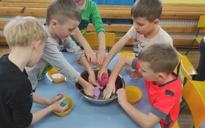 Kolejne zabawy SKRZATÓW gdzie pracowały stópki, rączki i oczka. Wczoraj robiliśmy gniotki, a dziś zabawy z cieczą nienewtonowską.