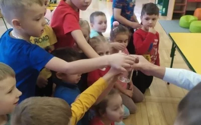 Ostatnio odwiedziła nas Pani farmaceutka czyli mama Antka M. Dzieci poznały nowy zawód i pracę w aptece. Pani Justyna miała szczególne zlecenie, otrzymała receptę na zrobienie witaminy dla Roberta L. Smerfy dzielnie pomagały, bo trzeba było szybko dostarczyć witaminy do Kataru żeby zdążyć przed meczem Udało się sprostać zadaniu, teraz tylko trzeba czekać na efekty kolejne zlecenie to krem do rąk dla Elzy, też zadanie wykonane, nawet trochę zostało to podzieliliśmy wszystkie mamy . Bardzo dziękujemy Pani Justynie i muszę przyznać, że kolejna mama wykazała się ogromną cierpliwością. Dostaliśmy także leki do apteki, kolejka była niesamowita, nawet mamy z dziećmi przychodziły po syropy. Na szczęście apteka dobrze zaopatrzona, więc dla nikogo nie zabrakło leku.