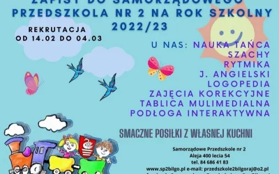 2022-02-16 Rekrutacja Zapisy do przedszkola na rok szkolny 2022/2023 Zapisy dzieci do przedszkola na nowy rok szkolny 2022/2023 będą prowadzone od 14.02.2022 do 4.03.2022 roku. Do przedszkola mogą być przyjęte dzieci z Miasta Biłgoraja, urodzone w rocznikach: 2016, 2017, 2018, 2019 oraz w miarę wolnych miejsc dzieci urodzone w miesiącach styczeń-marzec 2020 roku. (W naborze uzupełniającym będą mogły zostać przyjęte dzieci z innych gmin celu uzupełnienia ewentualnych wolnych miejsc). Wnioski do przedszkola są wydawane w kancelarii przedszkola, w grupach oraz do pobrania na stronie internetowej przedszkola. Przy rekrutacji dzieci do przedszkola brane są pod uwagę kryteria przyjęć, a nie kolejność zgłoszeń. Kryteria ustawowe: 1. Wielodzietność rodziny kandydata 10 pkt,2. Niepełnosprawność kandydata 10 pkt,3. Niepełnosprawność jednego z rodziców kandydata 10 pkt,4. Niepełnosprawność obojga rodziców kandydata 10 pkt,5.Niepełnosprawność rodzeństwa kandydata 10 pkt,6. samotne wychowanie kandydata w rodzinie 10 pkt,7. Objęcie kandydata pieczą zastępczą 10 pkt. Kryteria lokalne: 1. Dzieci sześcioletnie, które mają obowiązek odbyć przygotowanie przedszkolne, zamieszkałe w odległości do 3 km od przedszkola, w którym złożyły wniosek o przyjęcie 10 pkt,2. Dzieci pięcioletnie, zamieszkałe w odległości do 3 km od przedszkola, do którego złożyły wniosek o przyjęcie 10 pkt,3. Dzieci, których rodzeństwo uczęszcza do tego przedszkola 4pkt,4. Przedszkole znajduje się do 3 km od miejsca pracy rodziców 3 pkt,5. Przedszkole znajduje się do 3 km od miejsca zamieszkania innych opiekunów kandydata (dalszej rodziny kandydata wspomagającej rodziców w sprawowaniu opieki) 3 pkt,6.Rodzice kandydata są zatrudnieni lub prowadzą działalność gospodarczą na terenie Miasta Biłgoraja 2 pkt. (Należy dołączyć dokument potwierdzający zatrudnienie). czytaj dalej > -