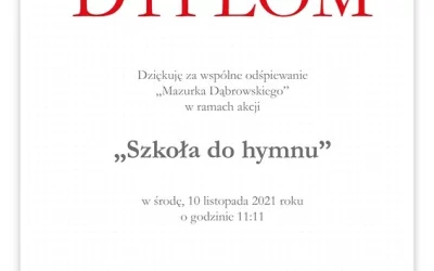 Szanowni Państwo Dyrektorzy, w imieniu Ministra Edukacji i Nauki Przemysława Czarnka serdecznie dziękuję za udział w akcji „Szkoła do hymnu”. Miło mi poinformować, że w tegorocznej inicjatywie wzięło udział blisko 21 tys. przedszkoli, szkół i placówek oświatowych z kraju oraz ponad 260 placówek polonijnych z całego świata. Cieszymy się, że 10 listopada o godz. 11:11 byli Państwo z nami! W załączeniu przekazuję pamiątkowy dyplom. Z wyrazami szacunku Anna OstrowskaRzecznik PrasowyMinisterstwo Edukacji i Nauki